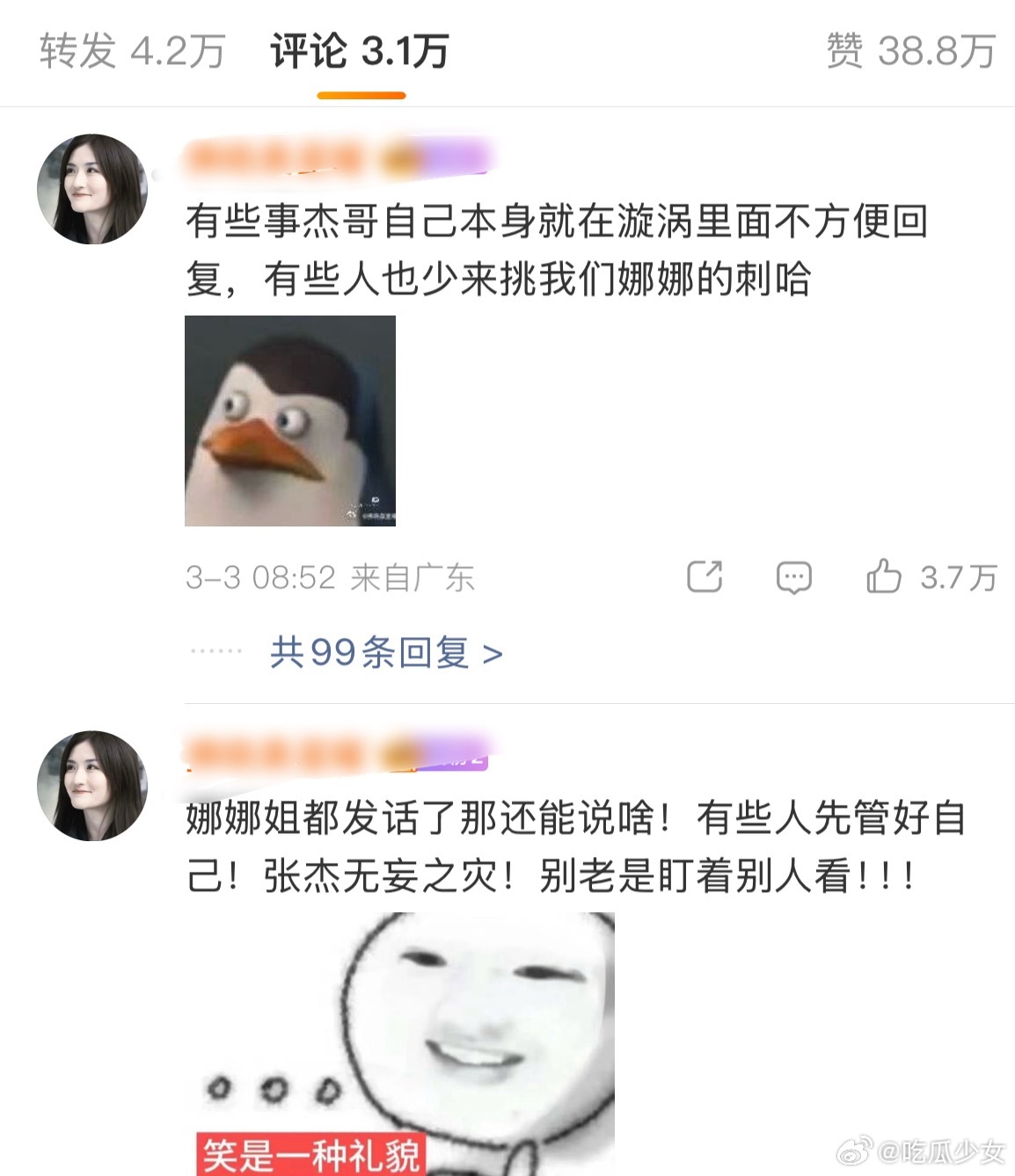 谢娜喊话薛之谦讲真,这波我站谢娜。谁家老公被阴阳怪气这么多年谁能忍啊?张杰当年粉丝凑钱解约是事实,靠实力翻红也是事实,凭啥一直被贴“软饭男”标签?薛之谦当年那段吐槽就算没点名,明眼人都知道在说谁,别拿“节目效果”当挡箭牌了。