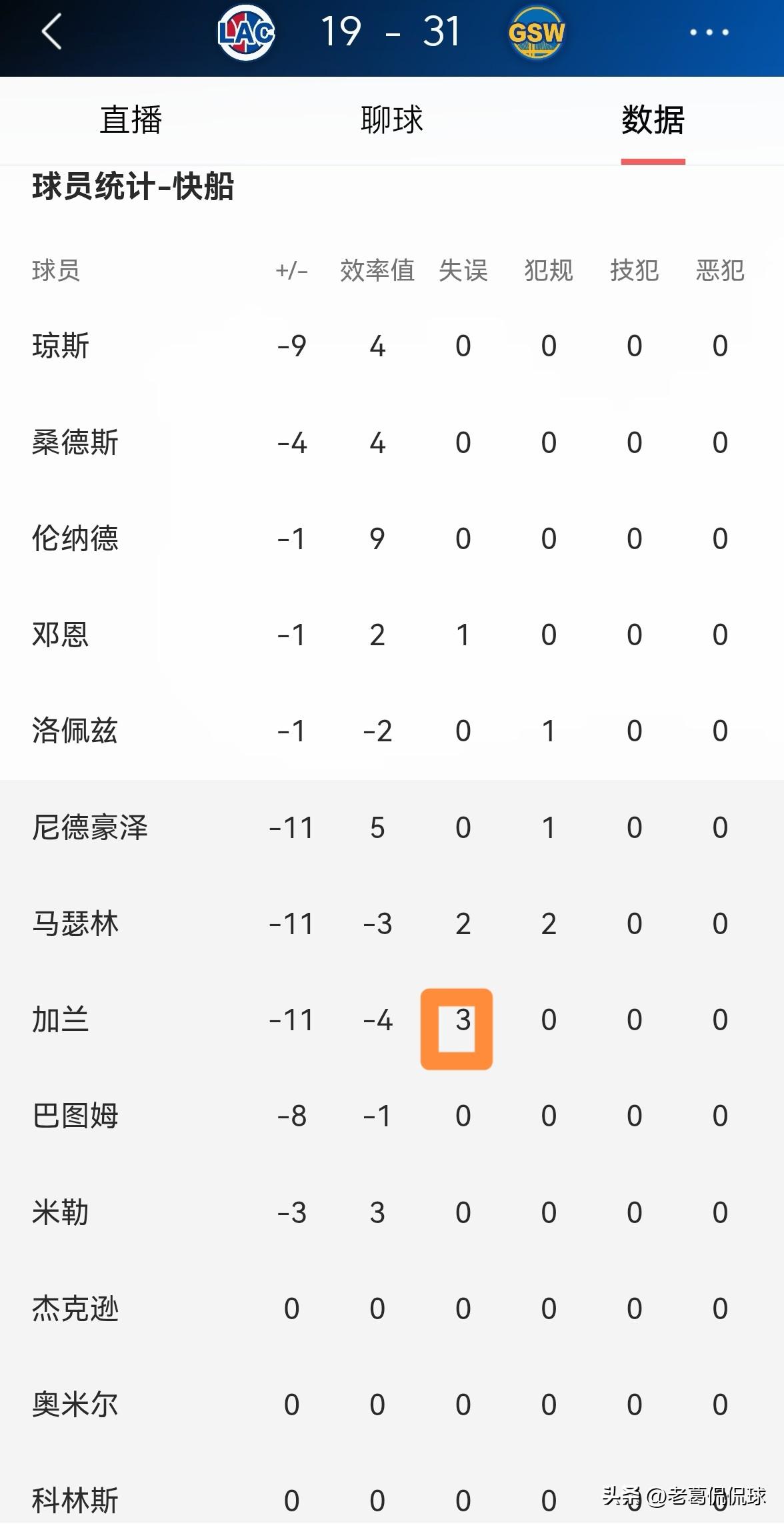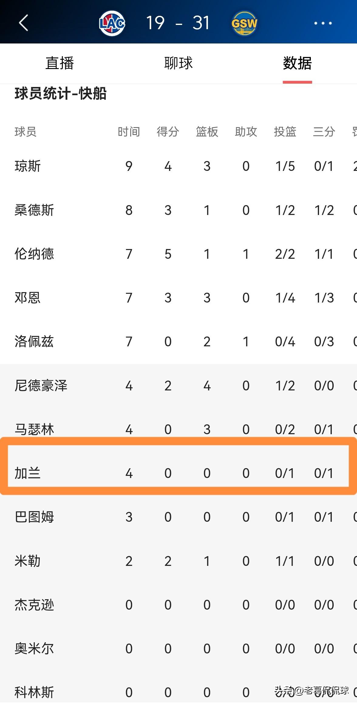 快船超级新援加兰真是彻底的懵了!在今天快船客场挑战勇士的比赛中,目前双方的第一节比赛已经结束,快船以19:31落后于对手。在首节比赛中,加兰完全属于懵圈的状态,他在替补出战的4分钟里,投篮1中0怒砍0分,却出现了3次非常离谱的失误,他的场上正负值为-11。 以加兰在第一节比赛中的糟糕状态来看,我预感本场比赛加兰的得分不会超过5分。