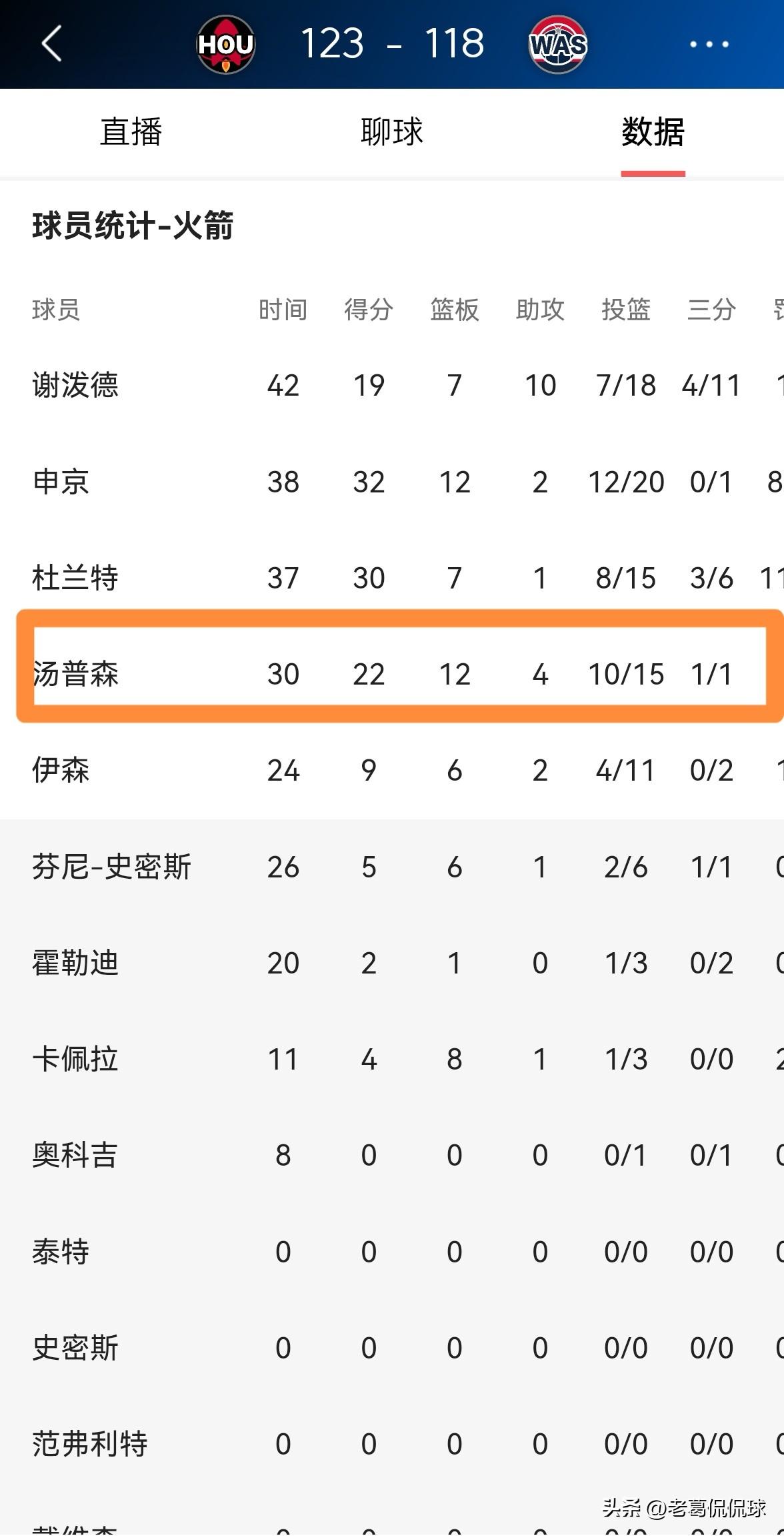 火箭球星阿门-汤普森的调整能力真是太强了!在今天火箭客场以123:118力克奇才的比赛中,阿门在第一节比赛表现不佳的情况下迅速的调整好了自己的状态,最终奉献了一场精彩的表现。 整场比赛下来,阿门首发出战30分钟,投篮15中10,其中三分球1中1、罚球1中1非常高效的砍下22分,还有12篮板4助攻2抢断,他的场上正负值为+6。 值得一提的是,在第一节比赛中,阿门投篮4中0怒砍0分,不过在随后的三节比赛中阿门爆砍22分,展现出了非常强的自我调整能力。