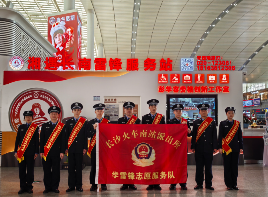 近年来,长沙南站派出所以党建为引领,立足岗位实际,持续创建雷锋警队党建品牌,将雷锋精神融入日常执勤、案件侦办、旅客服务全过程,打造忠诚、奉献、担当的新时代铁警队伍。今年春运期间,派出所专门设立雷锋服务岗,组建党员先锋队、青年民警学雷锋志愿服务队,全天候为旅客提供问询引导、困难帮扶、应急救助等服务,用坚守践行“人民公安为人民”的庄严承诺。