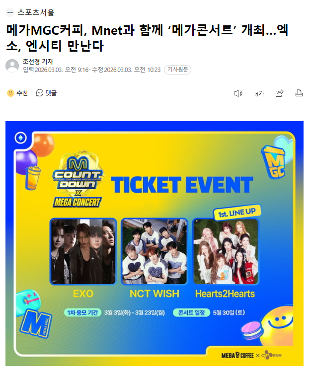 Mega MGC咖啡将与Mnet于5月30日合作举办《M COUNTDOWN X MEGACONCERT》。第一批出演阵容为EXO、NCT WISH、Hearts2Hearts。追加阵容将在今后依次公开。