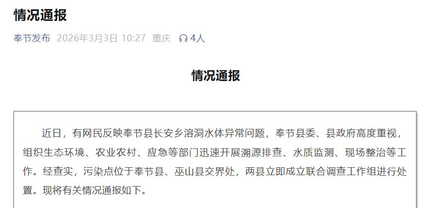 近日,有网民反映奉节县长安乡溶洞水体异常问题,奉节县委、县政府高度重视,组织生态环境、农业农村、应急等部门迅速开展溯源排查、水质监测、现场整治等工作。经查实,污染点位于奉节县、巫山县交界处,两县立即成立联合调查工作组进行处置。现将有关情况通报如下。
