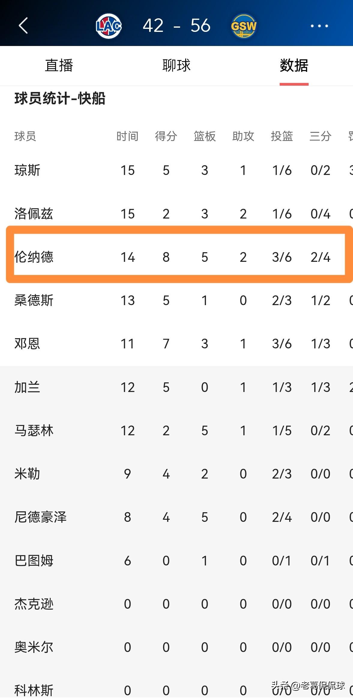 快船巨星伦纳德真是被彻底的锁死了!在今天快船客场挑战勇士的比赛中,目前双方的上半场比赛已经结束,快船以42:56落后对手14分。在前两节比赛中,伦纳德在勇士的疯狂包夹中完全被锁死了,他在首发出战的14分钟里,仅仅出手了6次,得到8分5篮板2助攻1抢断,他的场上正负值为-2。 老实说,勇士在前两节比赛中对伦纳德的防守是非常成功的,伦纳德完全没有打出应有的表现,伦纳德仿佛已经游离于比赛之外。