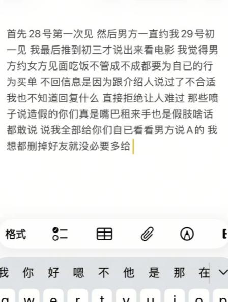 网上流传着一位“全清姐”,“全清姐”在老家相亲,遇到一位男生请她吃饭,然后要AA,“全清姐”吐槽:老家相亲,男恶不恶心就说吧! “全清姐”还说:“没事哥们,姐全请你都行”!“全清姐”因此而得名。后来,男生发现自己被“全清姐”挂在了网上,曝光了全部聊天记录,大家才发现,男生发信息,“全清姐”压根就不回!“全清姐”解释,已经跟介绍人说了不合适,不知道回复什么,直接拒绝怕让人难过! 最近网上最火的相亲瓜,当属安徽那位“全清姐”,本来只是一场再普通不过的老家相亲,没成想因为一顿饭、几句聊天,直接闹上了热搜,被全网围观,“全清姐”这个名号也跟着火遍全网,连带背后的细节被扒得底朝天。 可能很多人刷到过她吐槽的片段,但很少有人知道,这场看似简单的相亲纠纷,藏着很多被忽略的细节,直到男生曝光完整聊天记录,大家才看清整个事件的来龙去脉。 “全清姐”是安徽本地人,过年期间回老家,被家里长辈催婚,无奈之下答应了介绍人安排的相亲,和一位同龄男生见了面。 两人初次见面的地点选在老家县城的一家家常菜馆,环境不算高端,但也干净整洁,是当地人相亲常去的地方,见面过程还算顺利。 男生以为这次见面聊得不错,有继续接触的机会,就频繁给“全清姐”发消息,可不管男生发什么,“全清姐”都一概不回,既不拒绝,也不回应,就这么一直吊着对方。 直到大年初三,“全清姐”才终于松口,答应和男生再出来见一面,男生心里特别开心,特意收拾了一番,还提前规划好了当天的行程,想着好好表现,争取能改变“全清姐”的想法。 大年初三这天,两人先是一起逛了县城的商场,之后去看了一场刚上映的电影,中午在商场附近的咖啡店喝了东西,到了晚上,男生主动提出请“全清姐”吃饭,选了一家口碑不错的本地菜馆,点了几道特色菜,全程依旧是男生主动买单。 可让男生没想到的是,自从送“全清姐”回家后,她又恢复了之前的状态,再次失联,男生这才慢慢意识到,可能“全清姐”对自己确实没感觉,他憋了一天,终于在第二天上午发了一条消息,语气很体面,没有抱怨,只是问了一句:“不回消息是觉得不合适吗?”这条消息发出去后,“全清姐”很快就回复了,只有简单的两个字:“是的。” 得知答案后,男生心里虽然有点失落,但也接受了这个结果,他想了想,觉得两人只是相亲认识,没有确定关系,一整天的消费都是自己单方面承担,于是就鼓起勇气,给“全清姐”发消息,提出两人AA制分摊这435元的费用,可他万万没想到,就是这一句AA的提议,彻底激怒了“全清姐”。 “全清姐”看到消息后,当场就炸了,回复的语气带着明显的不耐烦和不屑,先是吐槽了一句:“老家相亲,男恶不恶心就说吧!”紧接着又撂下一句底气十足的话:“没事哥们,姐全请你都行。” 这句话一出口,瞬间显得她很大方,仿佛在嘲笑男生小气、算计,也正是因为这句“姐全请你都行”,网友们给她起了“全清姐”这个外号,慢慢在网上传开。 更让男生生气的是,“全清姐”发完这句话后,不仅没有真的主动承担全部费用,反而截图了男生要求AA的聊天记录,连打码都懒得打,直接发到了抖音上,丝毫没有考虑到男生的隐私。 男生是在刷抖音的时候,偶然看到自己被挂在了网上,评论区里有很多不明真相的网友,跟着“全清姐”一起吐槽他,甚至有人辱骂他,这让男生既委屈又愤怒。 为了证明自己的清白,也为了让大家看清事情的真相,男生只好把两人从相亲开始的全部聊天记录都曝光了出来。 从曝光的聊天记录中,大家才发现,事情根本不像“全清姐”说的那样,男生并不是小气、恶心,反而一直很真诚,主动发消息、主动安排行程、主动买单,而“全清姐”从始至终都很敷衍。 聊天记录曝光后,全网的风向瞬间反转,原本指责男生的网友,纷纷开始吐槽“全清姐”,觉得她的做法太过分,既吊着男生浪费对方的时间和金钱,又在网上挂人、曝光隐私,嘴上说着“姐全请你都行”,实际行动却很诚实。 面对网友的质疑和指责,“全清姐”也出面解释,说自己从初次见面后,就已经跟介绍人说了两人不合适,之所以不直接回复男生的消息,是因为不知道该说什么,怕直接拒绝会让男生难过,所以才选择了沉默,至于挂男生上网,也是一时生气,没有考虑太多。 截至2026年3月3日,“全清姐”已经删除了网上相关的吐槽视频,也没有再公开回应此事,男生也没有选择追究她的法律责任,这场闹得沸沸扬扬的相亲纠纷,慢慢平息了下来,但它带来的影响并没有消失。 很多人通过这件事明白,相亲本身是一件很正常的事情,合适就继续接触,不合适就坦诚拒绝,没必要拖着不回应,更没必要为了一时之气,在网上挂人、曝光隐私,既伤害了别人,也毁了自己的口碑。