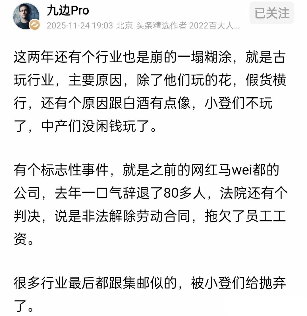 没错,古玩,白酒,包括邮票。全都没落了。年轻人不玩了,就没有未来了,所以就是死路
