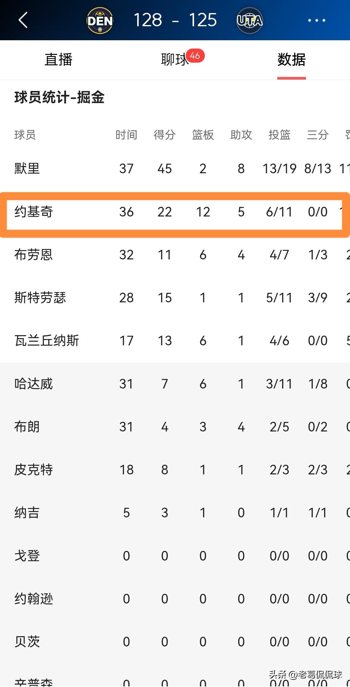 掘金当家球星约基奇真是太黯淡无光了!虽然今天掘金在客场以128:125力克爵士,但是身为NBA第一球星的约基奇却显得非常的黯淡,他完全成为了队友穆雷的陪衬。 整场比赛下来,约基奇首发出战36分钟,投篮11中6,其中罚球11中10仅仅得到22分,还有3次失误和5次犯规,他的场上正负值为+2。 说实话,本场比赛约基奇的进攻欲望并不强烈,这让掘金险些在客场爆冷不敌爵士。