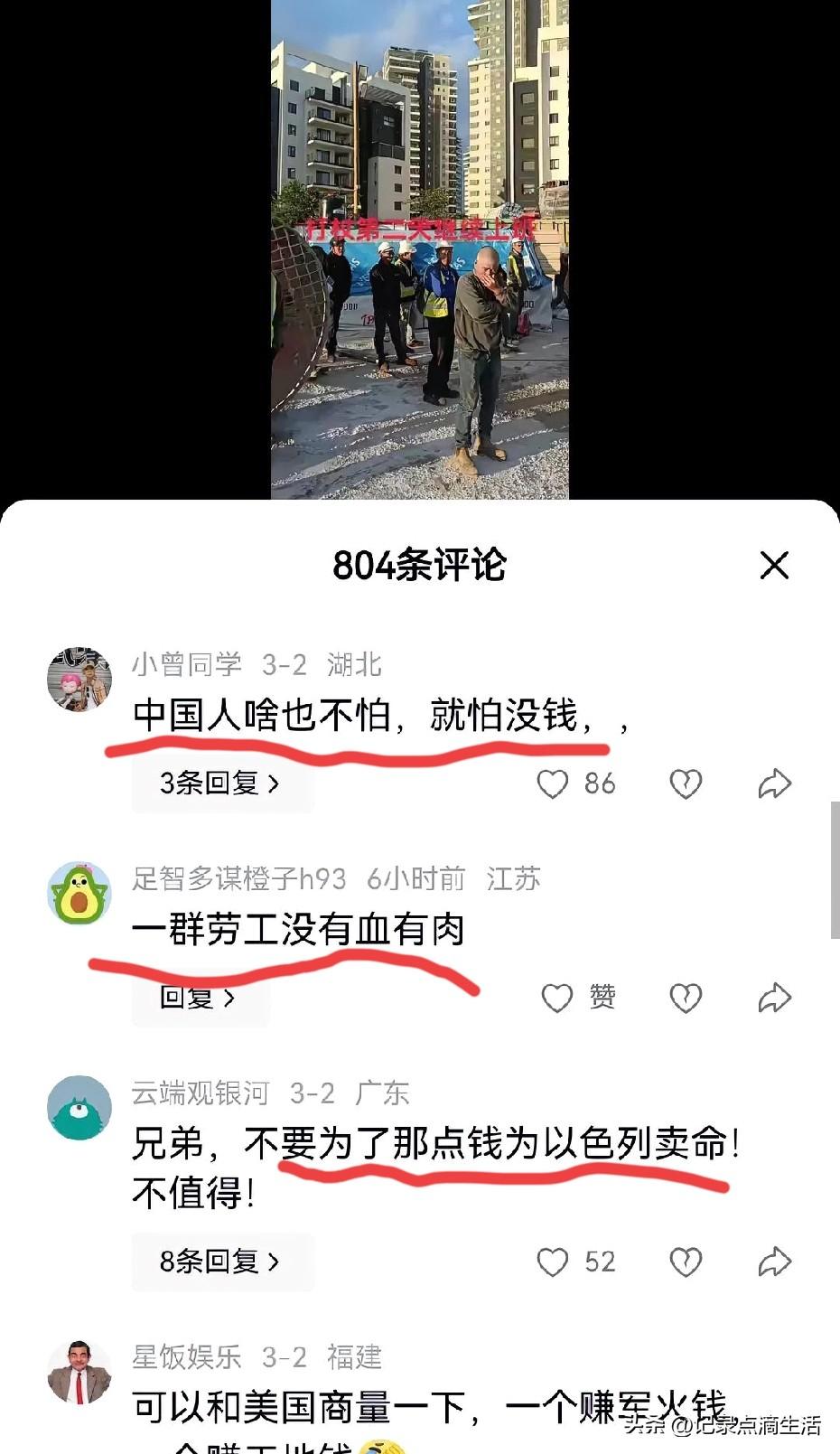 以色列在轰炸第二天坚持上班的视频,让很多人看傻了眼:在以色列打工的也只有中国人,能够头顶上火箭弹飞来飞去,远处爆炸声震天响,人家照样顶着炮火去上班,眉头都不皱一下。 有人说他们"要钱不要命",说他们穷怕了,所以死都不怕。但真是这样吗?如果不是生活所迫,谁愿意漂洋过海去一个正在打仗的地方讨生活?难道他们不想老婆孩子热炕头,对着电视屏幕指点江山吗? "人为财死,鸟为食亡",这句话听起来扎心,却道出了底层人的无奈。这些天以色列和伊朗那边局势紧张,防空警报隔三差五响,防空系统在空中拦截的声音就像过年放鞭炮,此起彼伏。 当地人都往防空洞跑,可咱们那些打工的兄弟姐妹,早上起来看一眼新闻,炸弹就在几公里外炸了,人家洗把脸,虽然带着满脸惊恐,照样准时出现在工地的大门口。 工地上有人问他:"你不怕啊?"他笑笑说:"怕如果有用的话,还会有残酷的战争吗?活干不完拿不到工钱,家里孩子等着交学费,房贷等着还。"嘴上说得轻松,其实走在上工的路上谁心里不哆嗦?只是哆嗦完了,还是得继续干活。 他们不是不怕死,是更怕穷,更怕别人看不起自己家人和孩子。怕欠一屁股债回去,怕让家里人失望,怕这一趟白出来,回去抬不起头。这些逆行者的手机里存着老婆、孩子的照片,每天收工的第一件事一定是给家里报平安。 他们中间有人家里老人病了,有人孩子要上学,有人欠了一屁股债,出来本来就是为了搏一把。他们在战火中干活,每一步都走在刀尖上,不是因为不怕死,是因为身后有个家,得靠他们撑着。 嘴上说的是为了钱,心里装的都是家。他们比谁都怕死,只是更怕活着回来两手空空。 别看他们嘴上笑的开心,内心深处比谁都痛苦,最渴望回国,可能就是他们。 其实哪有什么要钱不要命,不过是肩膀上扛着责任,脚下踩着钢丝,咬着牙往前走罢了。 生活这碗饭,端起来烫手,放下去又饿得慌。 咱们坐在家里刷视频的人,少说两句风凉话,多想想他们为啥这么拼。 谁不想安安稳稳的家人一起过太平日子?可有些人,安稳是奢侈品,拼命才是日常。 你觉得,换作是你,会怎么选?