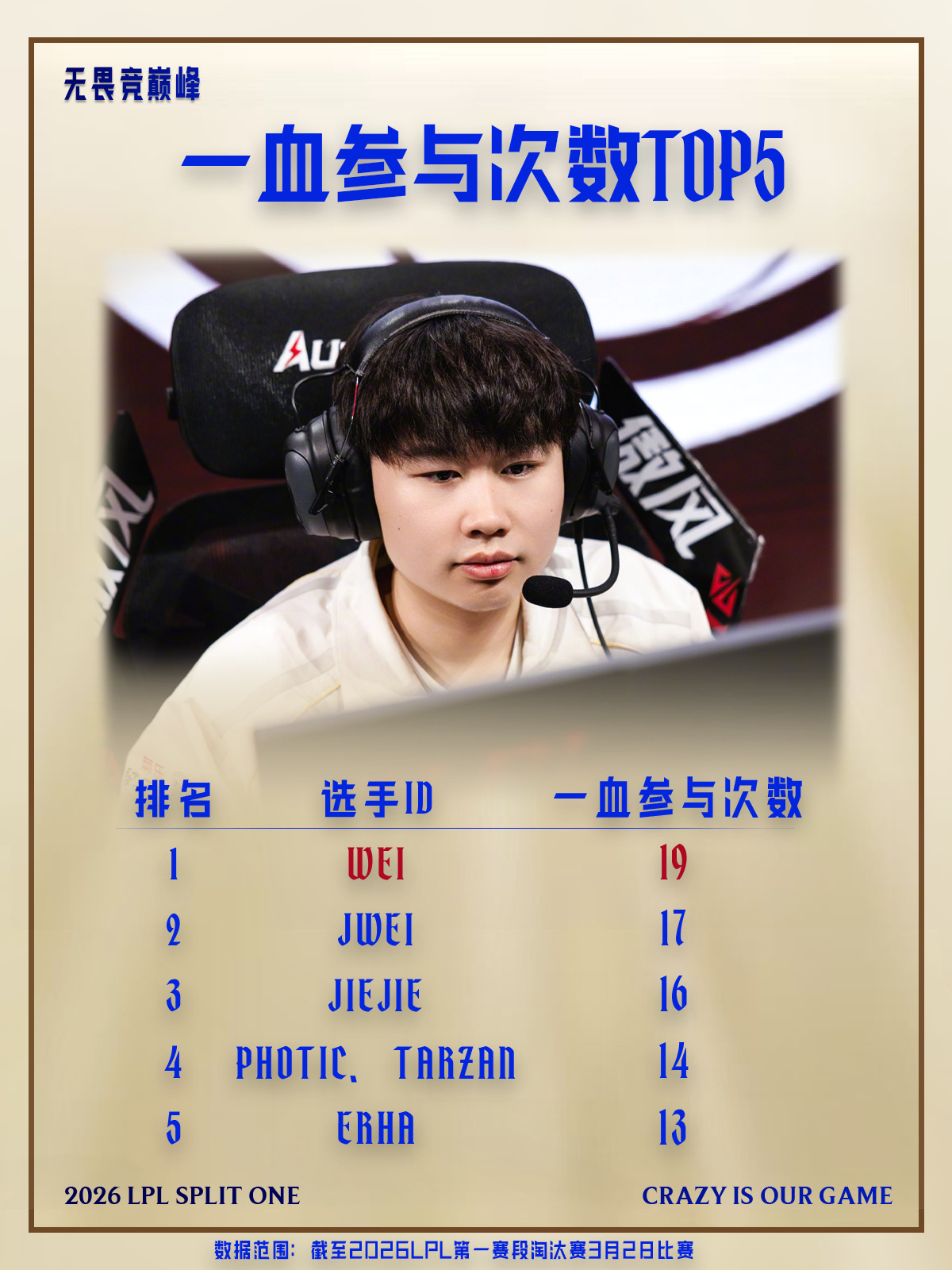2026LPL第一赛段至今,一血参与次数TOP5中,Wei以19次位列第一。