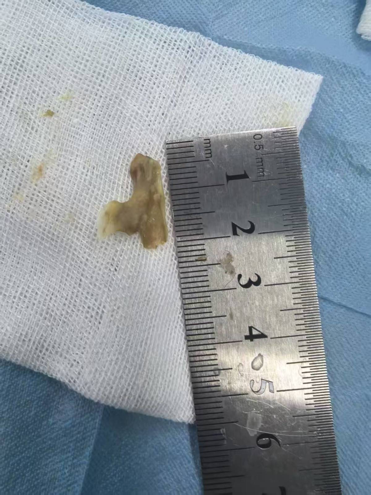 “这根鱼骨呈三角形,异常锋利,牢牢地卡在气道中。”呼吸内镜中心主任王振静介绍,“患者的气管黏膜已经充血水肿、糜烂,如果再不取出,可能导致气管穿孔、纵隔感染,甚至引发大出血,后果不堪设想。”呼吸内镜中心、医学影像科、麻醉科迅速联动,实施了无痛气管镜下异物取出术,才将这根骨刺成功取出。