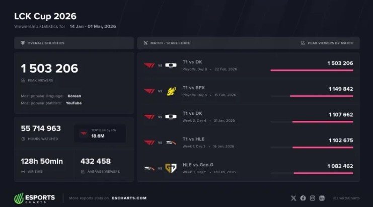 值得一提的是,LCK杯决赛GEN以3-0击败BFX夺冠的比赛未能进入观众峰值前五名。
