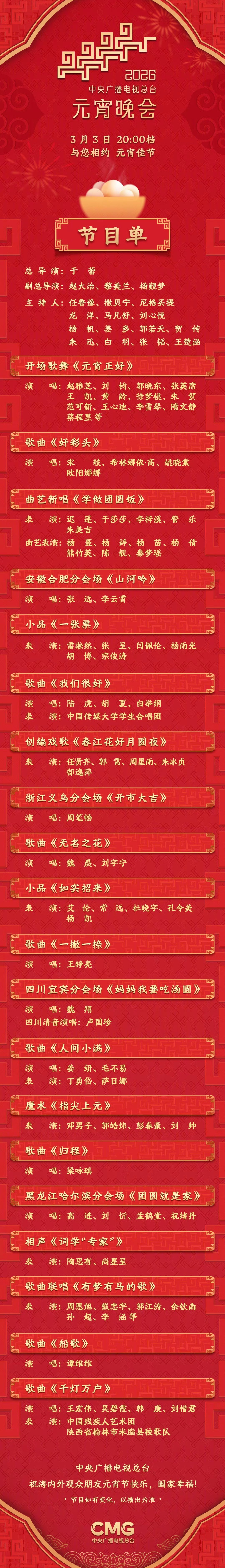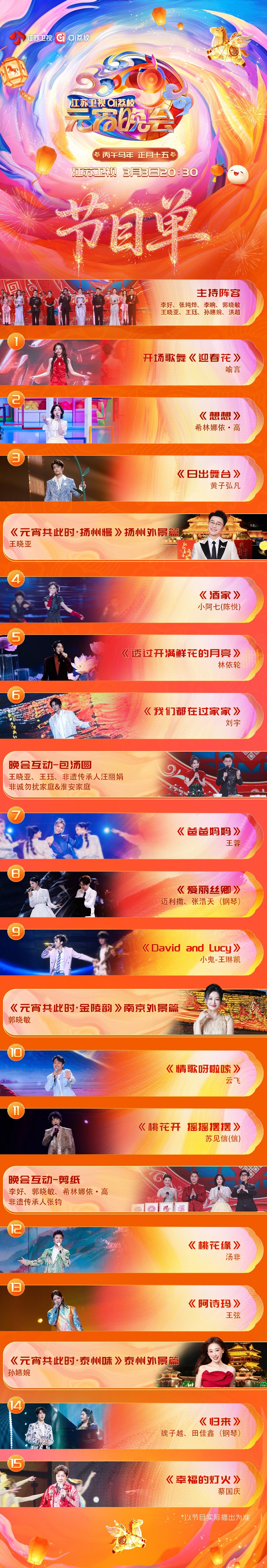 各大卫视今晚元宵晚会的节目单来了! 快来🐴住你想看的节目!元宵晚会节目单央视:周深、刘宇宁、魏晨、宋轶、欧阳娜娜、张远、李云霄、毛不易、希林娜依高江苏卫视:蔡国庆、黄子弘凡、王琳凯、刘宇、喻言湖南卫视:华晨宇、周深、檀健次、TFING(穆祉丞、邓佳鑫、张子墨、童禹坤、黄朔)、袁一琦、张峻豪、曾舜晞、刘宇、夏之光、罗云熙广东卫视:王祖蓝、李建、萨顶顶、AK刘彰河南卫视:蒋敦豪、陈瑶 央视元宵晚会湖南卫视元宵喜乐会江苏卫视元宵晚会2026元宵奇妙游节目单广东卫视元宵晚会