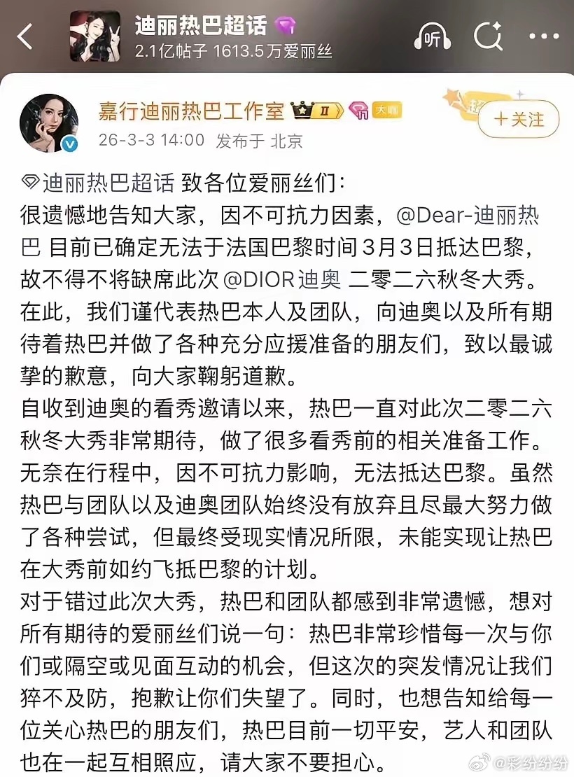 迪丽热巴滞留迪拜 就连明星迪丽热巴都已经被困迪拜三天。 据称,三天前,迪丽热巴飞往迪拜看秀,准备从这里飞往巴黎。随后,其团队人员先去了法国,留下迪丽热巴一个人,这个操作有点看不懂,为什么热巴身边一个工作人员都没有,只留下她独自面对突如其来的战火。 希望热巴平平安安,快点回国。 也希望所有同胞安全归来。 再美的风景,再奢华的享受,都抵不过“平安”二字啊。