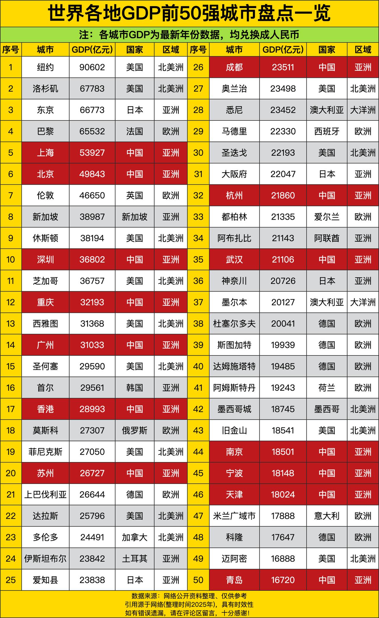 纽约以9.06万亿元人民币遥遥领先,成为全球最富有的城市。洛杉矶和东京分别以6.78万亿和6.68万亿元紧随其后,巴黎也超过了6.5万亿元。上海以5.39万亿元位列第五,北京4.98万亿元排在第六,这两座中国城市成功跻身全球十强。 仔细看这份榜单,能发现不少有意思的现象。中国共有12座城市上榜,是上榜最多的国家。除了上海、北京,深圳、重庆、广州、苏州等城市也都榜上有名。美国以14座城市的上榜数量排在首位,从纽约、洛杉矶到休斯顿、芝加哥,分布相当广泛。欧洲方面,伦敦、巴黎、莫斯科等城市表现突出,德国更是有多个城市入围。 这份榜单就像一面镜子,照出了全球城市经济的分布格局。北美、东亚、西欧形成了三大经济核心区,每个区域都有代表性的城市群。中国的崛起在这份榜单中表现得尤为明显,不仅上榜数量多,排名也相当靠前。不知道各位读者所在的城市上榜了吗?你觉得城市经济发展最看重什么?欢迎在评论区分享你的观察!