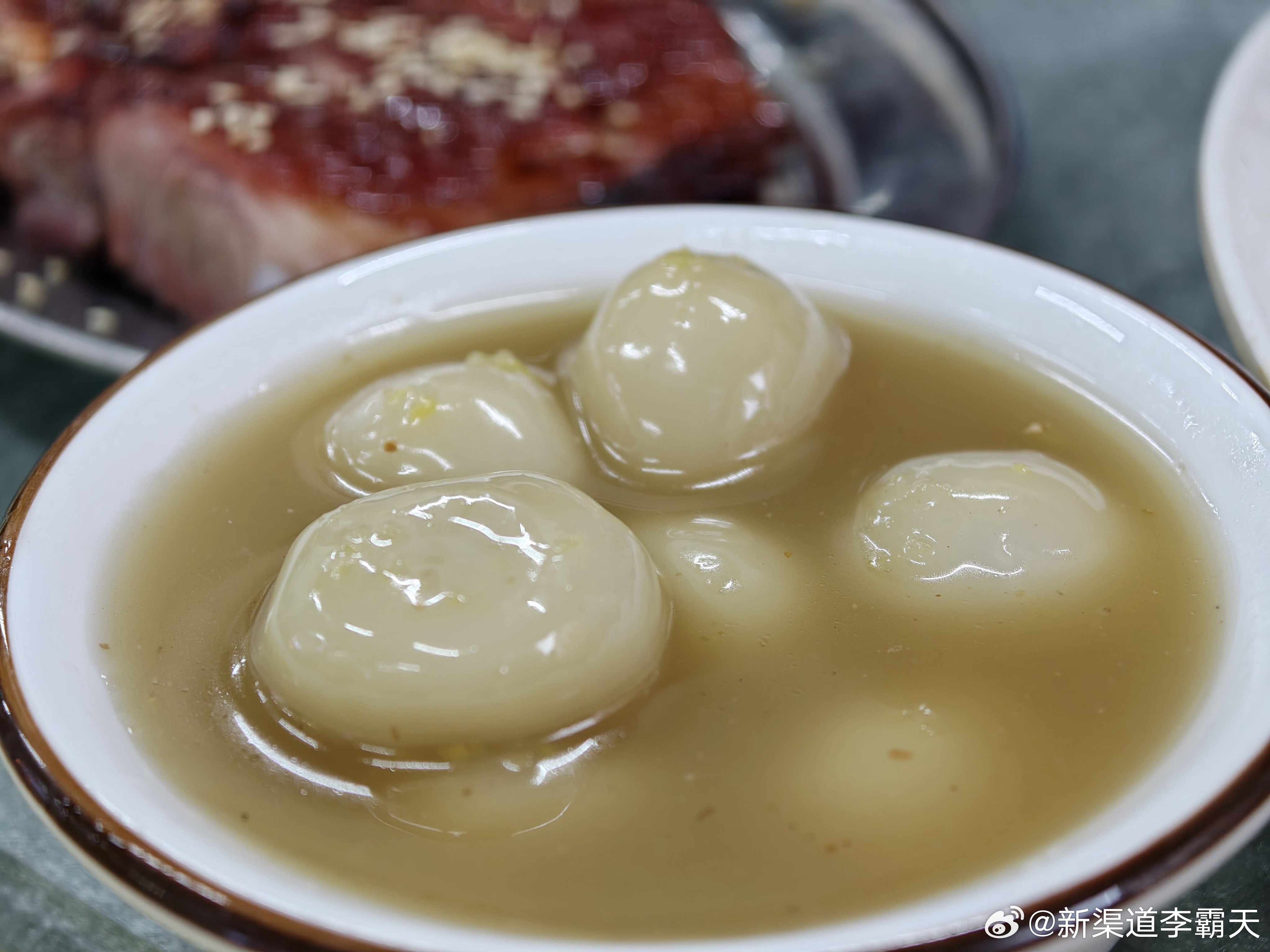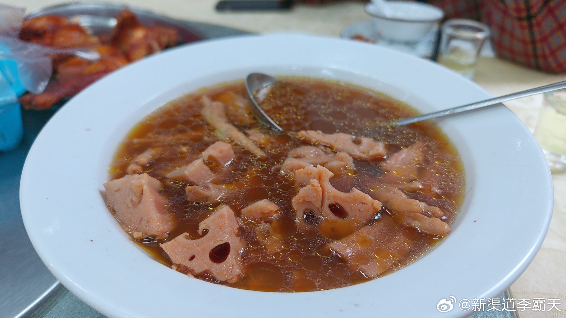 我们点了烧鸡、莲藕汤、小份蜜汁排骨和蒸河粉。烧鸡确实好吃,外皮烤得焦香酥脆,里面的肉又嫩又入味。莲藕汤也很不错,莲藕粉糯,汤底带着淡淡的甜。老板还额外送了我们一份汤圆~
