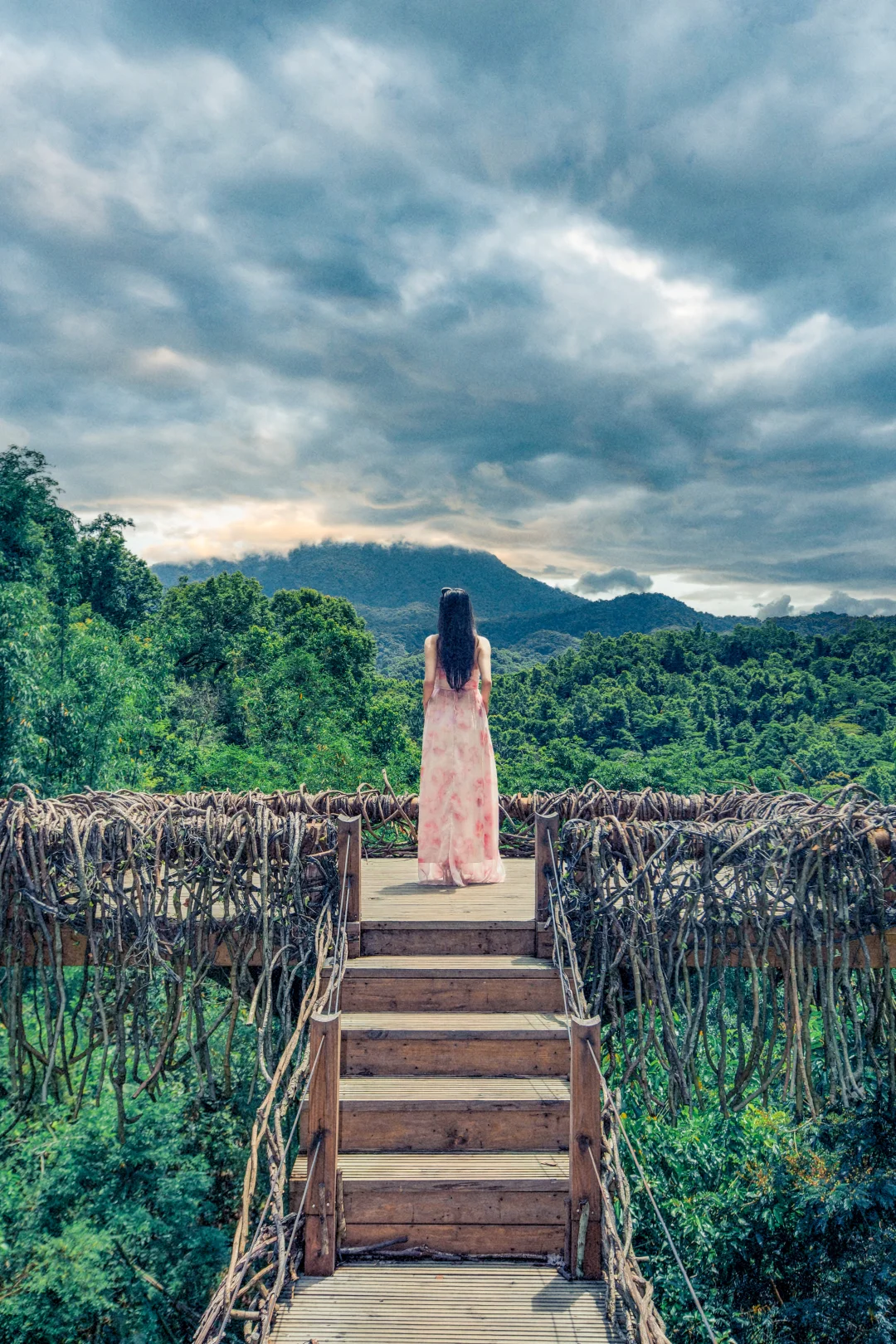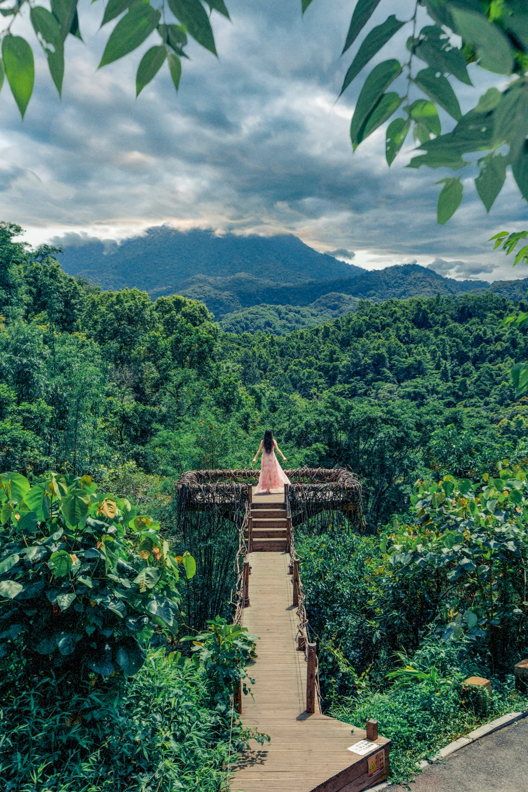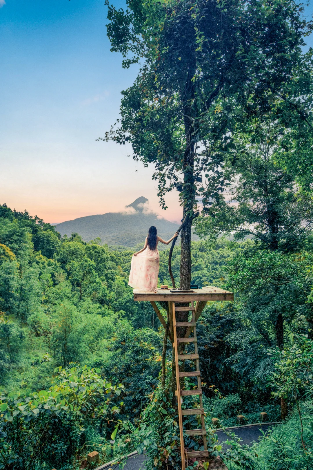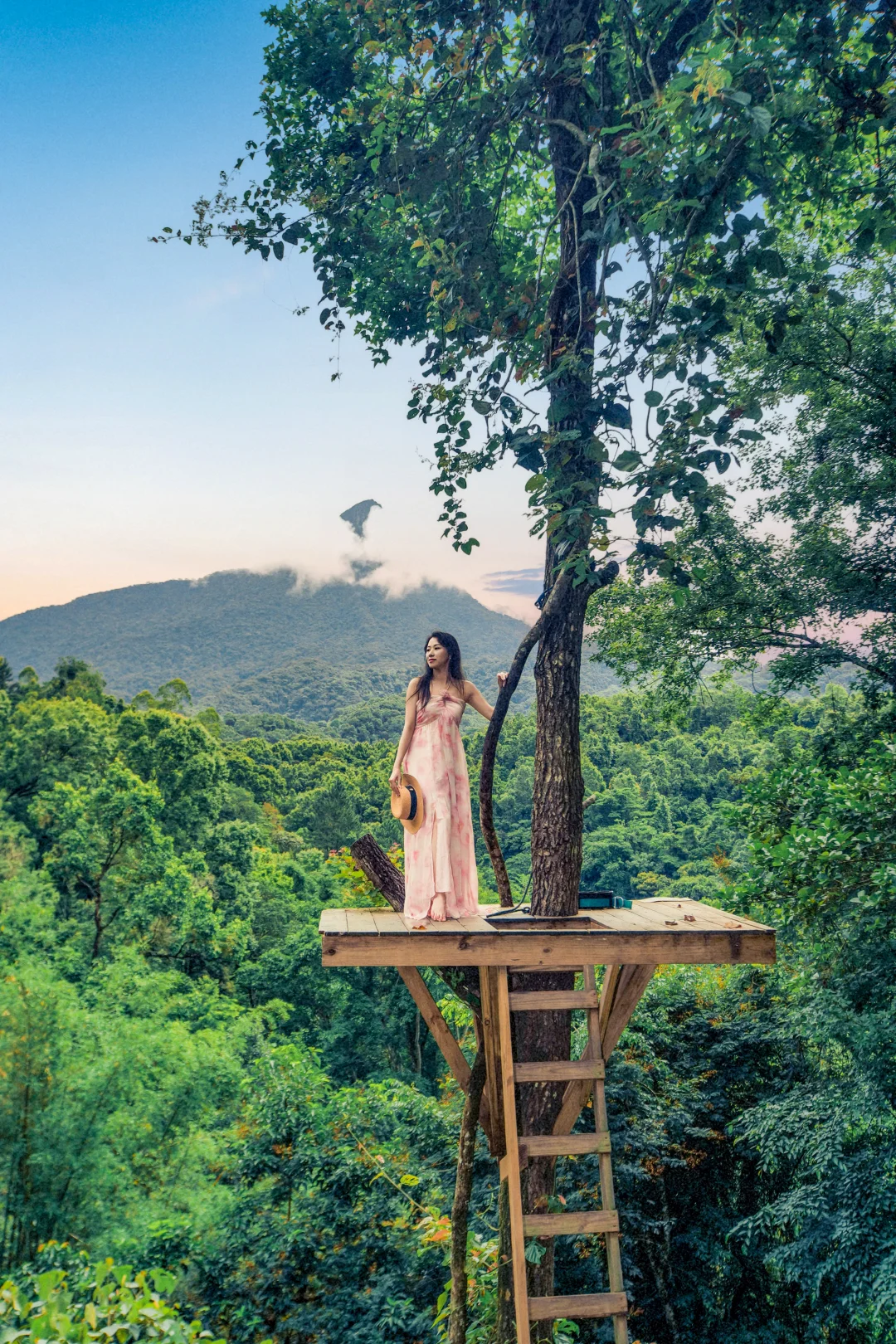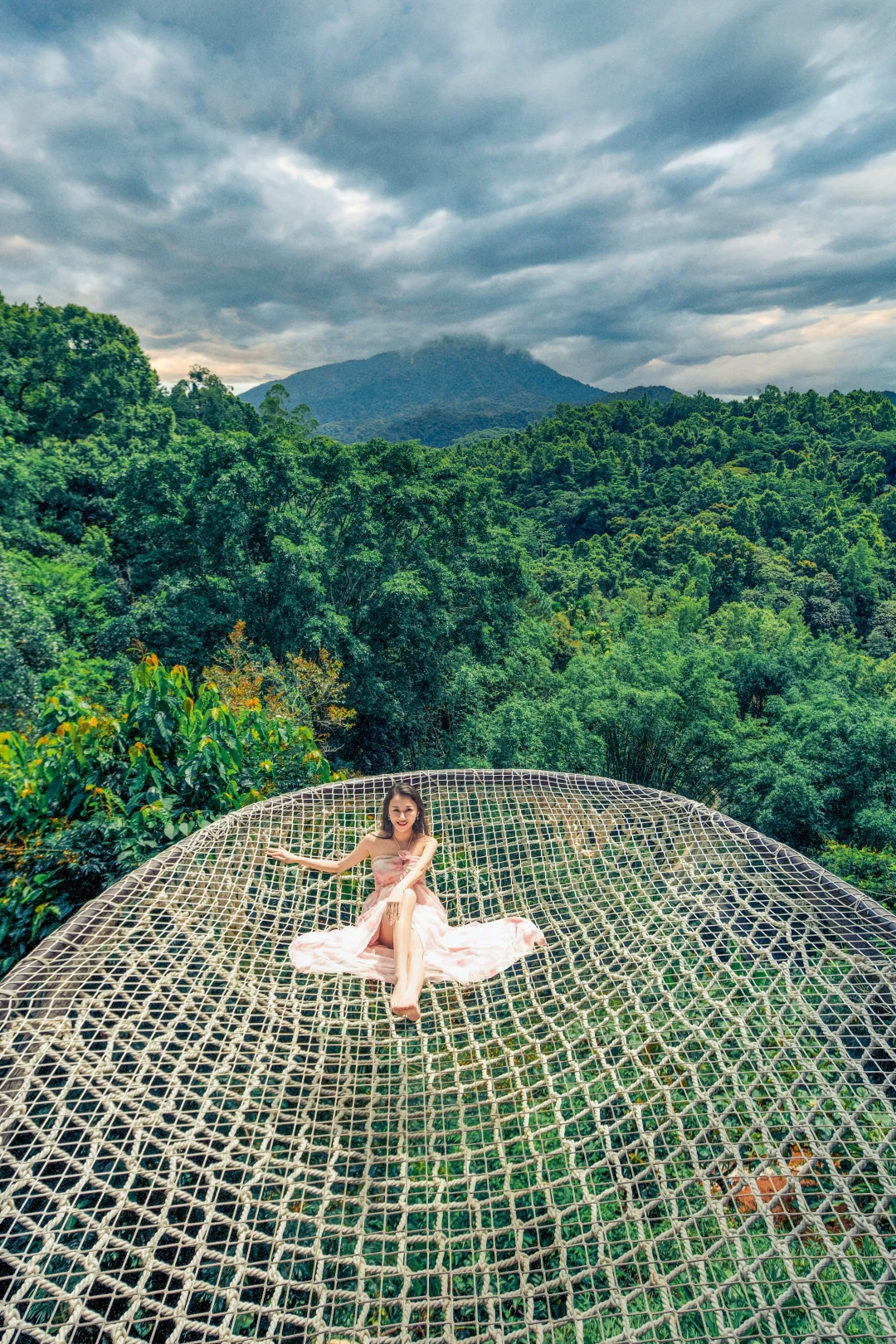 悬于山谷之间的白色绳网,躺下或坐下,以无边的雨林为背景,轻松拍出空灵治愈感。