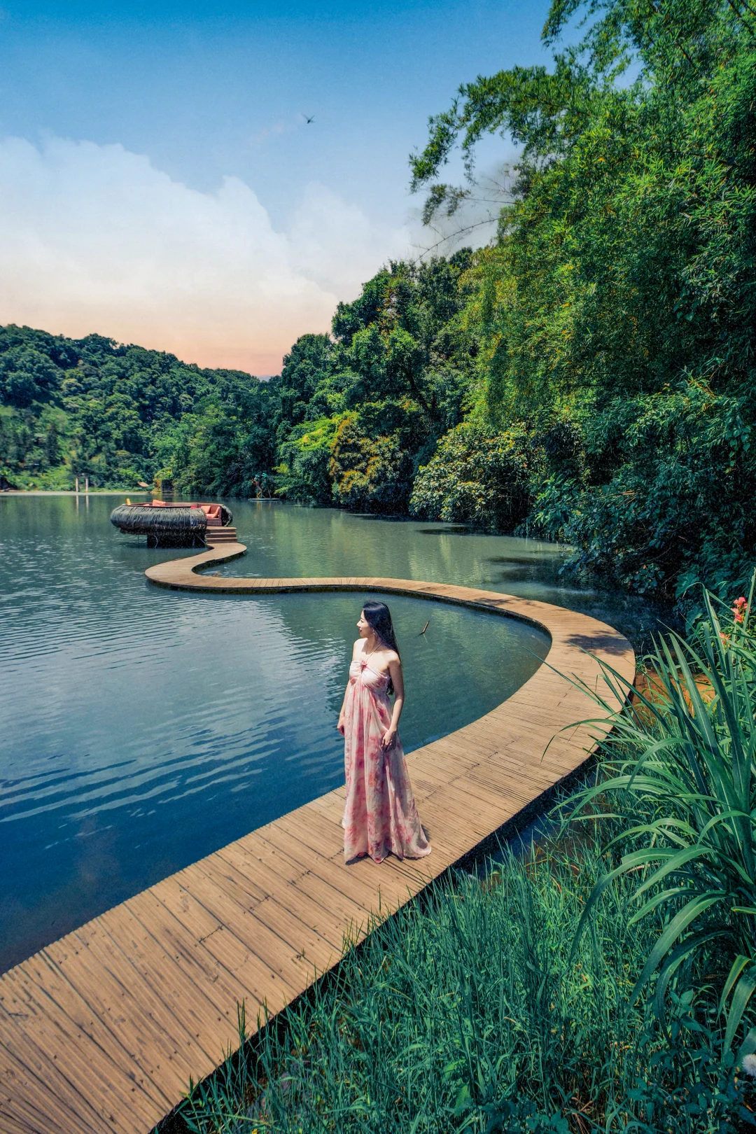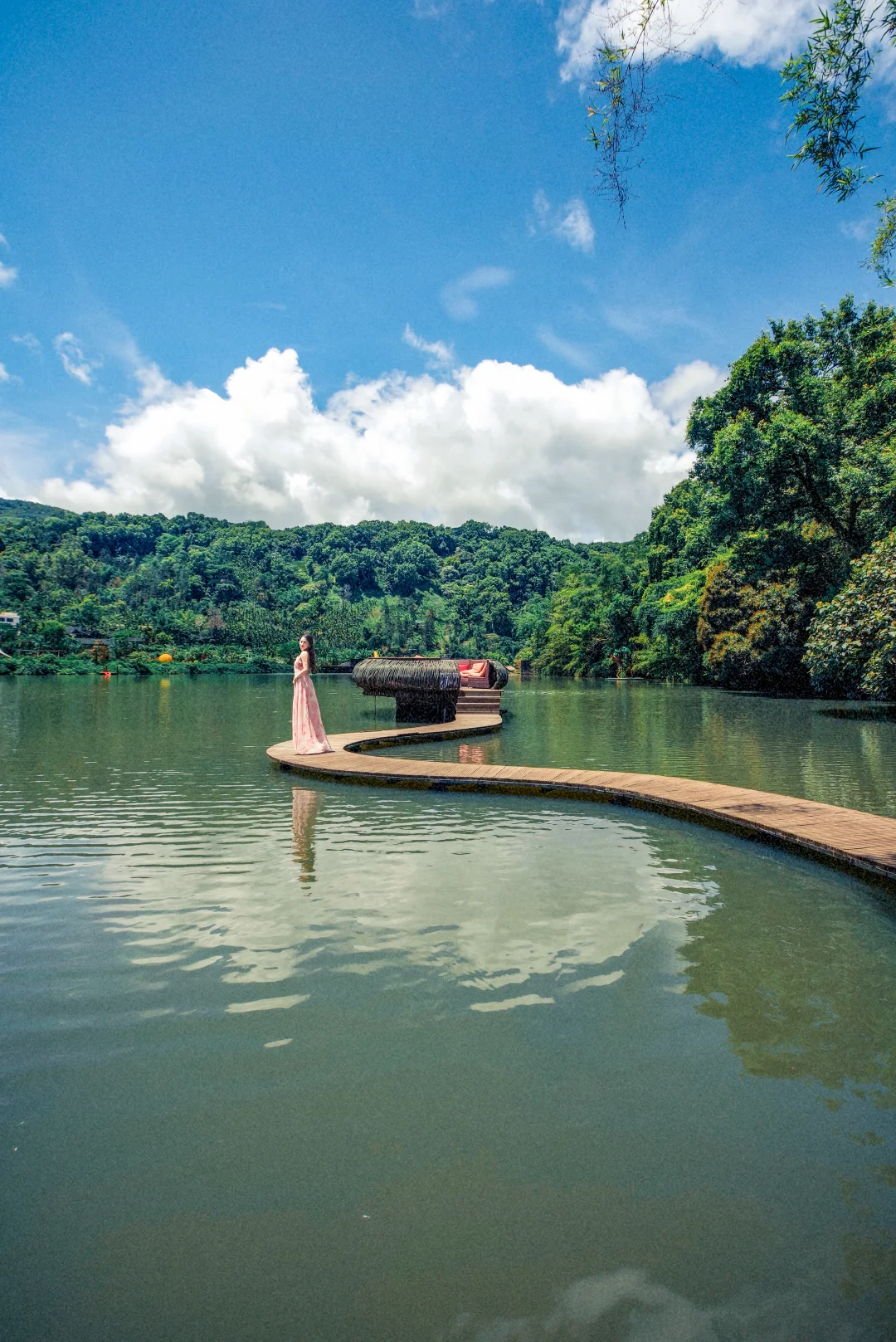 沿湖而建的木质栈道,湖面如镜,倒映着四周雨林,格外静谧。