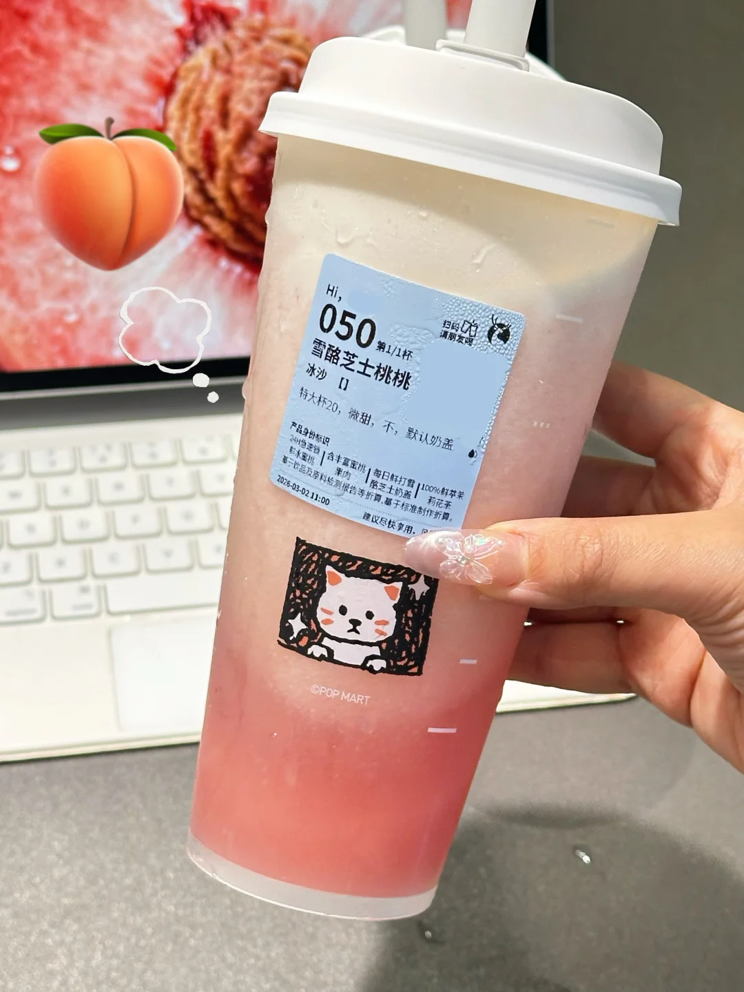 绝对不要搅拌!不搅拌更好喝!就像把春天喝进嘴里的感觉,好香!!!像咬了一口清甜爆汁的水蜜桃一样😭…每一口都能嚼到到蜜桃果肉,沙冰混合着桃子果肉,吸溜吸溜的满嘴桃香