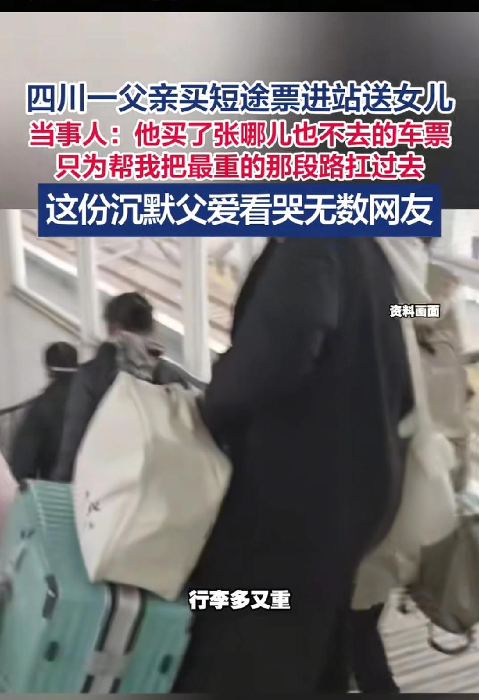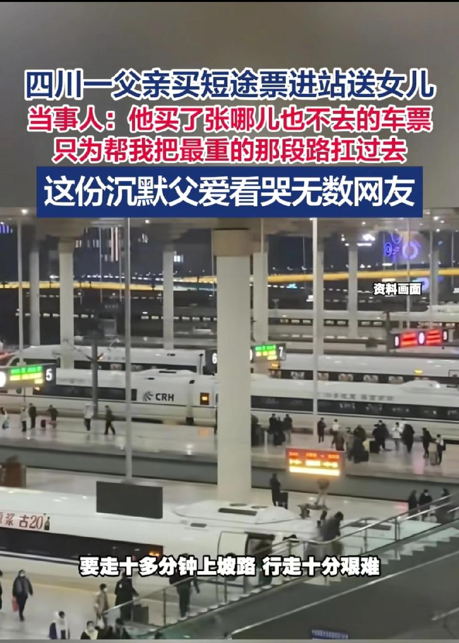看哭了!四川南充一位父亲,送大三女儿返校,悄悄买了一张只进站、不坐车的短途火车票,只为帮她扛过那段最艰难的上坡路,全程沉默不语,却感人肺腑! 2026年2月27日,年后返校高峰。 在成都读大三的范同学,早早收拾好行李,准备回学校。 她家在南充乡下,县城不通火车,每次返校都要先坐中巴颠簸几十公里,再转乘火车,一路折腾。 这次离家,母亲把能装的都给她塞上了: 厚被子、换季衣服、常用书本、家乡特产、…… 塞到最后,整整4个鼓鼓囊囊的大包+一个超重行李箱,堆在一起比人还高,别说一个女孩子,就算壮劳力拎着都费劲。 父亲看在眼里,全程没多说一句话,只是默默帮她把行李捆扎牢固,搬上中巴车。 一路上,他坐在女儿旁边,时不时转头看一眼堆在过道的行李,眉头轻轻皱着,心里一直在盘算:这么多东西,她一个人怎么扛得动? 颠簸近一小时,父女俩终于抵达南充北站。 屋漏偏逢连夜雨——车站正处于封闭翻修阶段。 原本便捷的通道全部停用,从检票口到站台,必须走一条临时通道: 全程十几分钟,全是上坡、台阶多、路面坑洼不平。 空着手走都气喘吁吁,更何况拖着这么多行李。 进站口,父女俩按往常那样简单道别。 女儿强装轻松,挥挥手笑着对父亲说:“爸,你快回去吧,我自己能行。” 她不想让父亲担心,更不想让他再为自己奔波劳累。 她以为父亲会像往常一样,看着她进站就转身回家。 于是,她深吸一口气,拽起行李就往里面走。 可刚走上坡路,行李的重量瞬间压下来。 箱子轮子卡在台阶缝隙里,拽不动、抬不起,几个包挂在胳膊上,勒得肩膀生疼。 她只能把身体压得很低,整个人往前倾,一步一挪,走两三步就不得不停下喘气。 汗水顺着额头往下淌,流进眼睛里,又涩又疼,胳膊酸得发抖,后背很快就被汗水浸透。 她咬着牙硬撑,不敢回头,怕一回头就绷不住,也怕父亲看见心疼。 可她万万没想到——父亲根本没走。 他就站在进站口外侧,隔着栏杆,远远望着女儿瘦小的身影,被一堆行李压得摇摇晃晃、步履艰难。 看着女儿每走一步都那么吃力,他的心像被一只手狠狠攥住,又酸又疼。 他在原地站了几秒,眼神越来越坚定,转身就往售票厅跑。 他拉住工作人员,急着问清楚: “进站到站台,路好走不?有没有电梯?孩子一个人,行李特别多。” 得知是长上 坡、没电梯、路远难走,父亲当场就下定了决心: 我必须进去帮她。 没有车票不能进站,这是规矩。 他没有丝毫犹豫,直奔窗口,自掏腰包买了一张最近班次、到遂宁的短途火车票。 这张票,他不坐车、不出行、不到任何地方去, 唯一的用途,就是换一张能走进站台、帮女儿扛行李的资格。 拿着票,他快步安检、检票,一路小跑追上女儿。 女儿正累得满脸通红、头发凌乱,低头拼命拽箱子,忽然眼前一暗,一个熟悉的身影站在了面前。 她一抬头,愣住了。 父亲什么也没问,什么也没感慨, 只是上前一步,稳稳抓住那个最重、最难拖的大行李箱,一把从女儿手里接过来,语气平淡却不容拒绝: “我来帮你拿。” 一路上,父亲走在前面,沉默地扛着行李、爬坡、避行人。 他脊背宽厚,步子稳而有力,把所有重量都扛在自己肩上,全程没喊一声累,没说一句苦。 女儿跟在身后,看着父亲微微有些佝偻的背影,看着他耳角悄悄冒出的白发,鼻子一酸再酸,眼泪在眼眶里打转,一句话也说不出来。 一直送到车厢门口,父亲踮起脚,把沉重的行李稳稳举进行李架,仔仔细细摆好、固定住,生怕列车晃动掉下来。 直到所有行李都安顿妥当,他才轻描淡写地对女儿说了一句: “我买了张短途票,进来送送你。” 没有煽情,没有表白,没有多余情绪, 轻得像一句再平常不过的闲话。 安顿好女儿,他没有多停留一分钟,立刻转身下车。 来时扛着超重行李,走时两手空空, 他只是来帮她扛过人生最难的那一段上坡路,任务完成,便悄悄退场。 火车缓缓开动,女儿趴在车窗边,望着父亲渐渐远去、越变越小的背影, 所有强撑的坚强瞬间崩塌,眼泪控制不住地汹涌而出。 后来她哽咽着把这段经历发出来,一句话戳碎全网: “他买了一张哪儿也不去的车票,只为帮我扛过最难的那一段路。 我们都内敛,不说爱,只靠行动。” 网友瞬间破防: “父爱从不多言,却永远在你最累、最难、最撑不下去的时候,悄悄出现 消息来源:海报新闻及网络公开内容,本文配图/视频素材来自海报新闻,以上仅用于内容分享,侵权即删,谢谢!