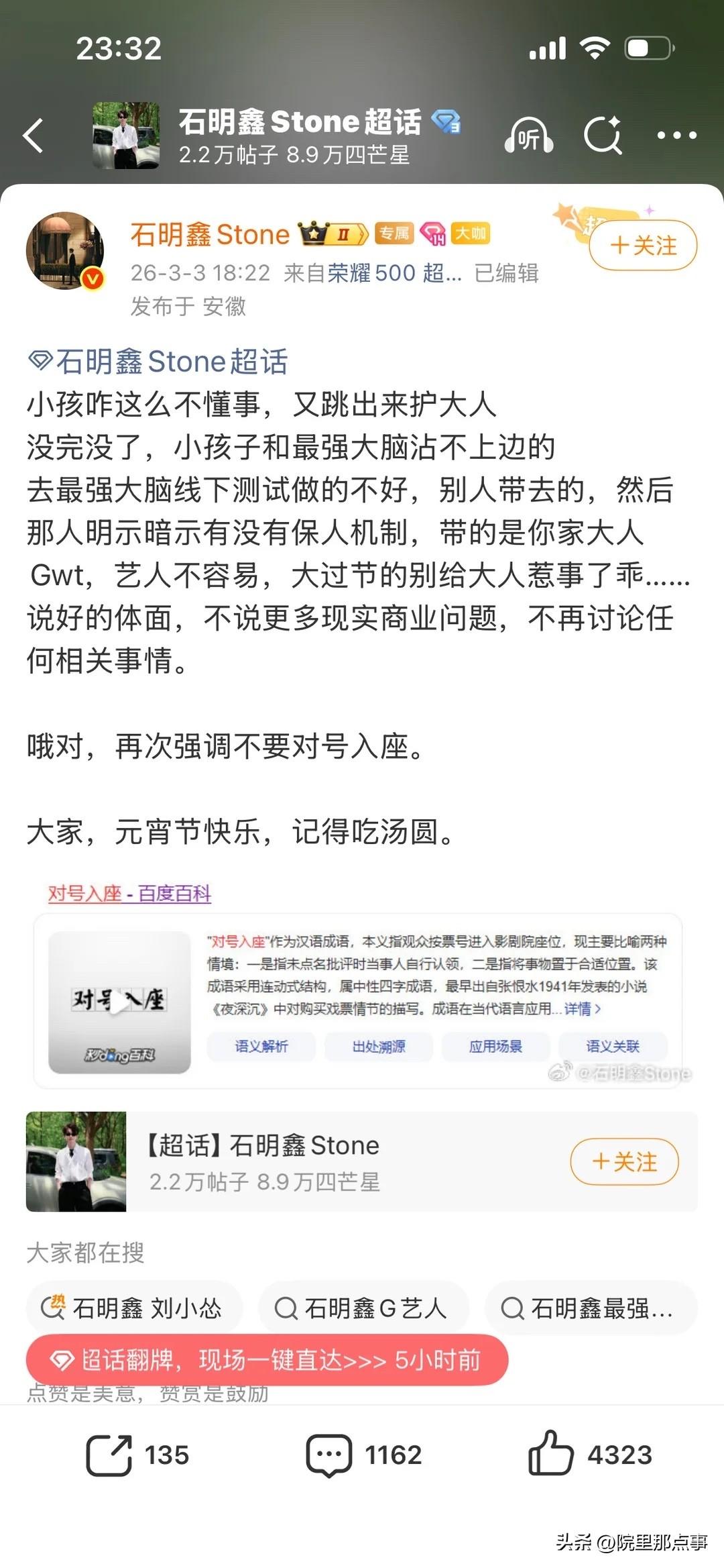 石明鑫掀桌参与的人越来越多了 之前围观了她们的辩证都是蒲熠星参加了那郭文韬不可能参加因为两个人要避嫌,但没看到有人反驳这类言论,就觉得挺搞的,还说蒲当嘉宾了那郭去肯定也是,我直接一个大问号 毕竟石明鑫没说是今年,去年,还是几年前她们自动认定是蒲在的这两年,就这么逻辑和论证 后来刘小怂和kb都相继跳出来惹怒了石明鑫他直接点名了[泪奔]粉丝又换了一套说辞说他对郭文韬爱而不得[捂脸][捂脸][捂脸]我真的服了粉丝还拉踩大脑,今早就是看到有大脑的选手出来了 我想看最后什么结果,别互相扯头花,我还想知道郭文韬会不会出现,还是只让其他人和粉丝上