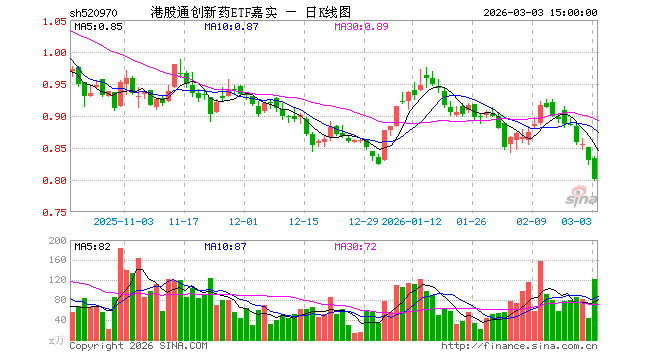 3月3日,港股通创新药ETF嘉实(520970)跌3.73%,成交额9905.04万元。当日份额增加800.00万份,最新份额为12.18亿份,近20个交易日份额增加1400.00万份。最新资产净值计算值为9.80亿元。
