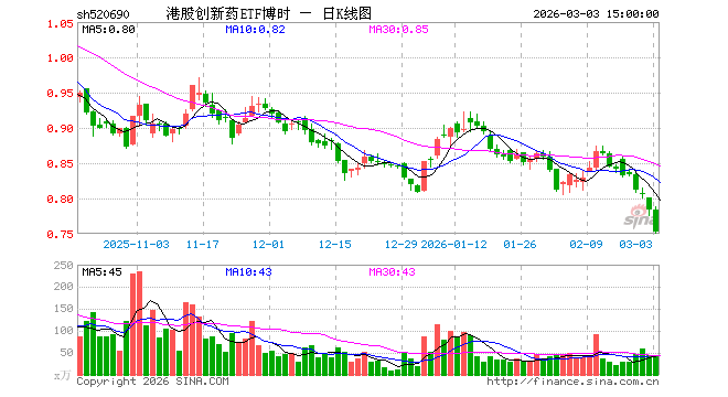 3月3日,港股创新药ETF博时(520690)跌3.96%,成交额3437.86万元。当日份额增加200.00万份,最新份额为6.22亿份,近20个交易日份额增加4600.00万份。最新资产净值计算值为4.72亿元。