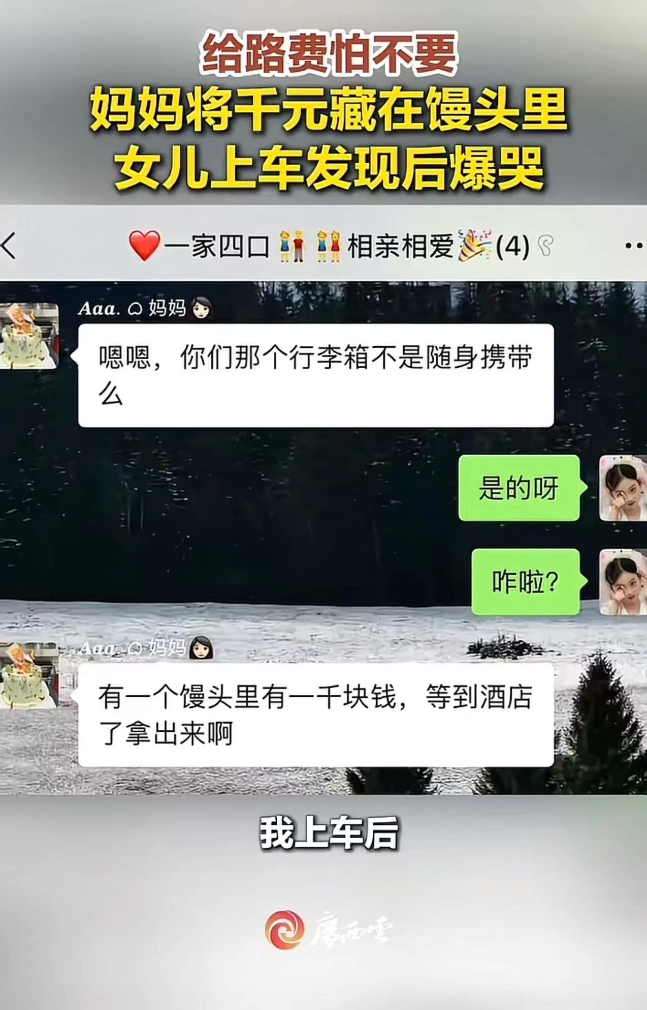 可怜天下父母心!”辽宁icon的一位妈妈,怕女儿不要路费,悄悄把1000块钱藏在馒头里,女儿发现后哭了——这不仅是一则温情的故事,更是当下无数家庭爱的缩影。 这位妈妈的举动,看似朴实无华,却道出了一个深刻的现实:父母对孩子的爱,有时是藏在细微处的无声守护。她怕女儿因为“面子”或者“独立”而拒绝接受帮助,于是用这样一个小小的“秘密”表达了她的关心和牵挂。谁能想到,一块普通的馒头里竟藏着一颗沉甸甸的爱心? 这件事一经曝光,立刻引发了无数网友的共鸣和热议。有人说:“这就是父母的爱,细腻而无私。”有人感叹:“在这个快节奏的社会,多少人还能做到这样默默付出?”更有人吐槽:“为什么我们长大了,反而越来越难坦然接受父母的好意?”这些评论背后,是每个人心中那份对亲情的渴望和复杂情绪的交织。 事实上,这种“怕孩子不要钱”的心态,折射出的是当代家庭关系的微妙变化。随着社会独立意识的增强,年轻人更希望靠自己的力量生活,不愿轻易接受父母的资助,怕被看作“啃老”。而父母呢,却总是用各种方式表达他们那份无法言说的牵挂和担忧。于是,这种“暗藏关爱”的行为,成了爱的另一种语言。 然而,透过这件小事,我们更应该看到一个更深层次的问题:现代家庭沟通的缺失。为什么父母和孩子之间会有这样的“隐形墙”?为什么爱要藏在馒头里,而不是坦诚地说出来?这背后,隐藏着多少代际之间的误解和无奈。 或许,这正是我们每个人都需要反思的地方。父母的爱,不应该是“偷偷摸摸”的,而应该是开放而温暖的。孩子们,也不必因为独立而拒绝接受那份最纯粹的关怀。只有当双方都敢于打开心扉,真正理解彼此,才能让这份亲情变得更加坚不可摧。 这位妈妈用馒头藏钱的故事,给了我们一个温暖的启示:爱,不需要华丽的语言和惊天动地的举动,它可以很简单,很平凡,就像一块馒头里的1000元,静静地守护着远方的孩子。 所以,当你下次看到父母递过来的“多余”关心时,不妨放下心防,试着接受他们的爱。毕竟,那个藏在馒头里的1000块钱,不只是钱,更是他们对你无尽的牵挂和祝福。 这件小事,也让我们明白,亲情的力量有多大——它能穿越时间和空间的距离,温暖你最孤单的时刻。你有没有类似的经历?有没有哪一次,父母的一个小举动,让你瞬间泪目?欢迎留言分享你的故事,让我们一起见证那些藏在生活细节里的真情。可怜天下父母心!”辽宁icon的一位妈妈,怕女儿不要路费,悄悄把1000块钱藏在馒头里,女儿发现后哭了——这不仅是一则温情的故事,更是当下无数家庭爱的缩影。 这位妈妈的举动,看似朴实无华,却道出了一个深刻的现实:父母对孩子的爱,有时是藏在细微处的无声守护。她怕女儿因为“面子”或者“独立”而拒绝接受帮助,于是用这样一个小小的“秘密”表达了她的关心和牵挂。谁能想到,一块普通的馒头里竟藏着一颗沉甸甸的爱心? 这件事一经曝光,立刻引发了无数网友的共鸣和热议。有人说:“这就是父母的爱,细腻而无私。”有人感叹:“在这个快节奏的社会,多少人还能做到这样默默付出?”更有人吐槽:“为什么我们长大了,反而越来越难坦然接受父母的好意?”这些评论背后,是每个人心中那份对亲情的渴望和复杂情绪的交织。 事实上,这种“怕孩子不要钱”的心态,折射出的是当代家庭关系的微妙变化。随着社会独立意识的增强,年轻人更希望靠自己的力量生活,不愿轻易接受父母的资助,怕被看作“啃老”。而父母呢,却总是用各种方式表达他们那份无法言说的牵挂和担忧。于是,这种“暗藏关爱”的行为,成了爱的另一种语言。 然而,透过这件小事,我们更应该看到一个更深层次的问题:现代家庭沟通的缺失。为什么父母和孩子之间会有这样的“隐形墙”?为什么爱要藏在馒头里,而不是坦诚地说出来?这背后,隐藏着多少代际之间的误解和无奈。 或许,这正是我们每个人都需要反思的地方。父母的爱,不应该是“偷偷摸摸”的,而应该是开放而温暖的。孩子们,也不必因为独立而拒绝接受那份最纯粹的关怀。只有当双方都敢于打开心扉,真正理解彼此,才能让这份亲情变得更加坚不可摧。 这位妈妈用馒头藏钱的故事,给了我们一个温暖的启示:爱,不需要华丽的语言和惊天动地的举动,它可以很简单,很平凡,就像一块馒头里的1000元,静静地守护着远方的孩子。 所以,当你下次看到父母递过来的“多余”关心时,不妨放下心防,试着接受他们的爱。毕竟,那个藏在馒头里的1000块钱,不只是钱,更是他们对你无尽的牵挂和祝福。 这件小事,也让我们明白,亲情的力量有多大——它能穿越时间和空间的距离,温暖你最孤单的时刻。你有没有类似的经历?有没有哪一次,父母的一个小举动,让你瞬间泪目?欢迎留言分享你的故事,让我们一起见证那些藏在生活细节里的真情。