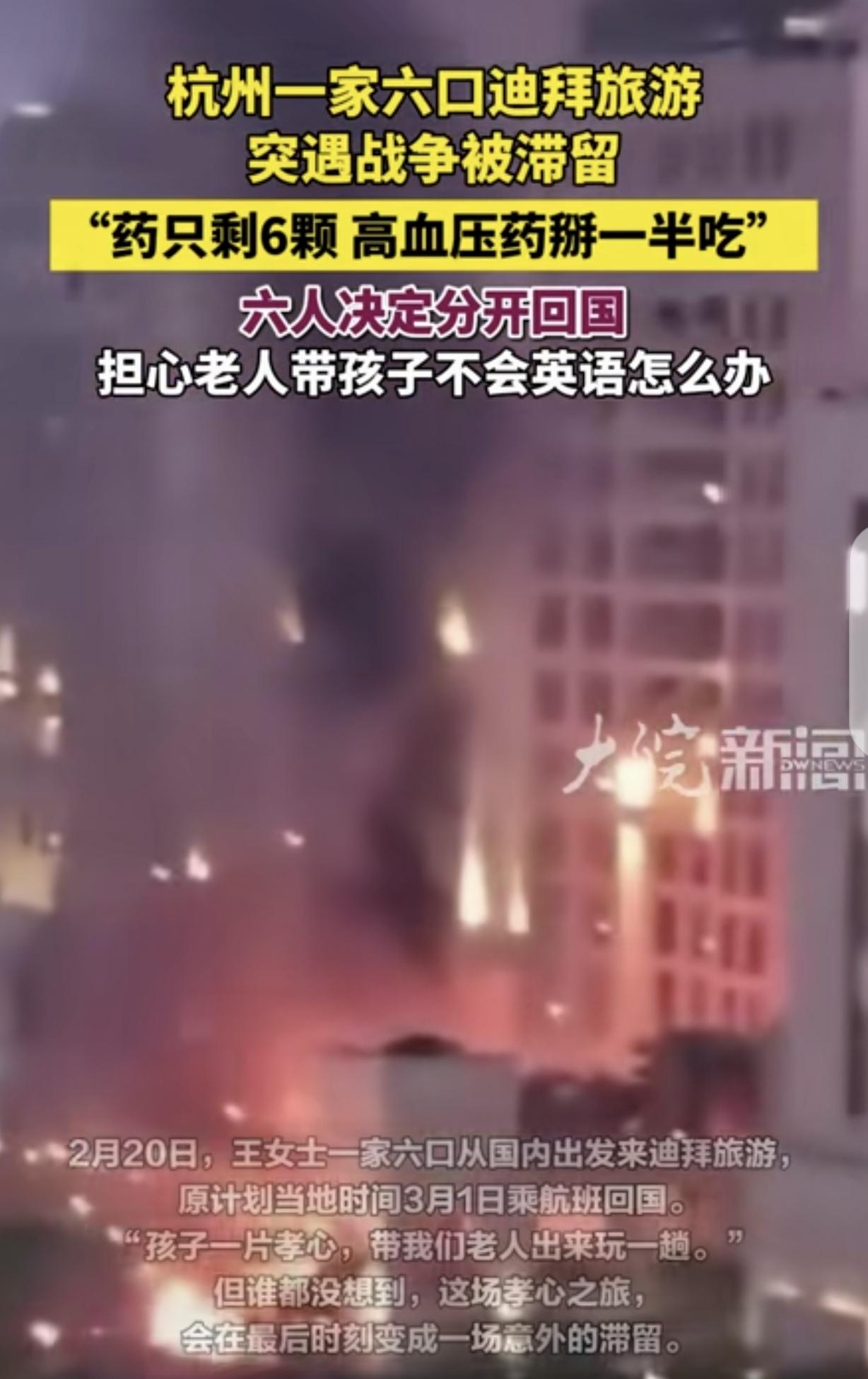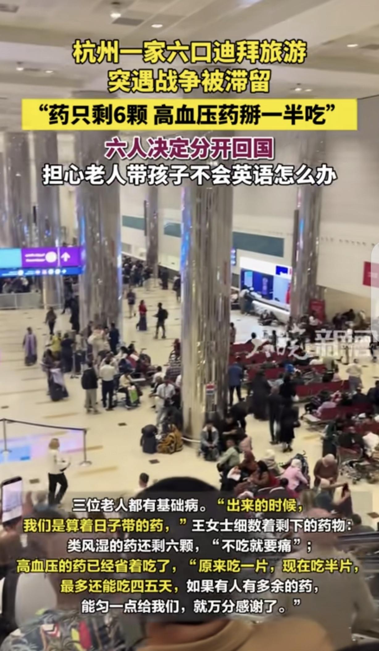 “有钱任性!”浙江杭州,一男子一家6口,不听劝告,非去迪拜旅游,突遇战争滞留,去的时候好好的,却回不来了!更可怕的是,3个老人都有基础病,出来时,算着日子带的药,类风湿的药只剩6粒,不吃就痛,高血压原来吃1片,如今吃半片,还能吃4-5天,但药店又不敢去,最终,男子决定分开回国,3个老人和孩子先走,他们夫妻后走,可老人和孩子不会英语,可如何是好?   最近刷到浙江杭州一家人的遭遇,真是让人又揪心又无奈,一对夫妻带着三位老人、一个孩子,一共六口人,2月20号从杭州出发去迪拜旅游。   本来想着趁机会带老人孩子好好放松几天,原计划当地时间3月1号就坐飞机回国,可谁能想到,突如其来的战火打乱了所有计划,真就是网友说的,去的时候好好的,如今却被困在当地回不来了。   然而这家人也没料到会出这种事,出发前压根没多想,毕竟谁也不会预测到战争会突然爆发,更让人揪心的是,同行的三位老人都有基础病,出发的时候,大家都是算着旅行天数带的药,没多做准备。   糟糕的是现在类风湿的药只剩6粒,老人不吃就浑身疼,根本熬不住;高血压的药更紧张,原本每天吃1片,现在只能省着吃半片,就算这样,也顶多还能维持4-5天。   本来想着去当地药店买,可外面不太平,时不时能听到断断续续的爆炸声,半夜手机还会响起紧急警报,一家人吓得都不敢出门,更别说去药店了,夫妻俩急得团团转,反复给航司打电话,排队快一个小时才能接通。   最后实在没办法,只能决定分开回国,能改签的最近航班只剩4个位置,只能让三位老人带着孩子先飞杭州,他们夫妻俩则改签到了3月6号。   可新的难题又来了,三位老人年纪大了,压根不会说英语,连基本的沟通都做不到,连求助都不知道怎么开口,好在天无绝人之路,当地的华侨华人妇女联合会送来了老人急需的高血压药,一家人的心态也稍微平复了一些。   其实换位思考一下,这家人也挺不容易的,本来是一场孝心之旅,结果变成了一场意外的滞留,他们一开始可能也没关注到迪拜的局势,抱着侥幸心理出门,可谁能想到会遇到战争这种极端情况。   这件事也给大家提了个醒,出去旅游尤其是带老人孩子,一定要提前关注目的地的局势,不能大意,老人有基础病,药一定要多带点,别算着日子带,万一遇到突发情况,真的会很被动。   现在只希望这一家人能顺利改签,平平安安回到国内,也希望当地的局势能尽快稳定下来,让更多滞留的人能早日回家。