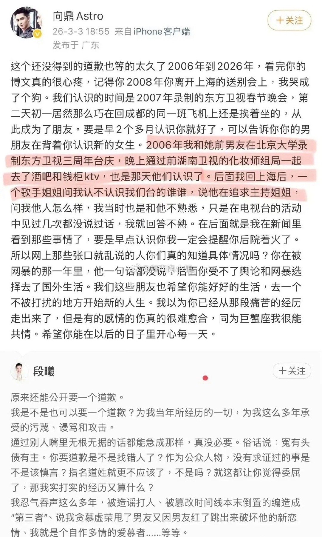 向鼎在微博里说,他和段曦是2007年在东方卫视春晚后台认识的,后来在回成都的飞机上邻座,成了朋友。