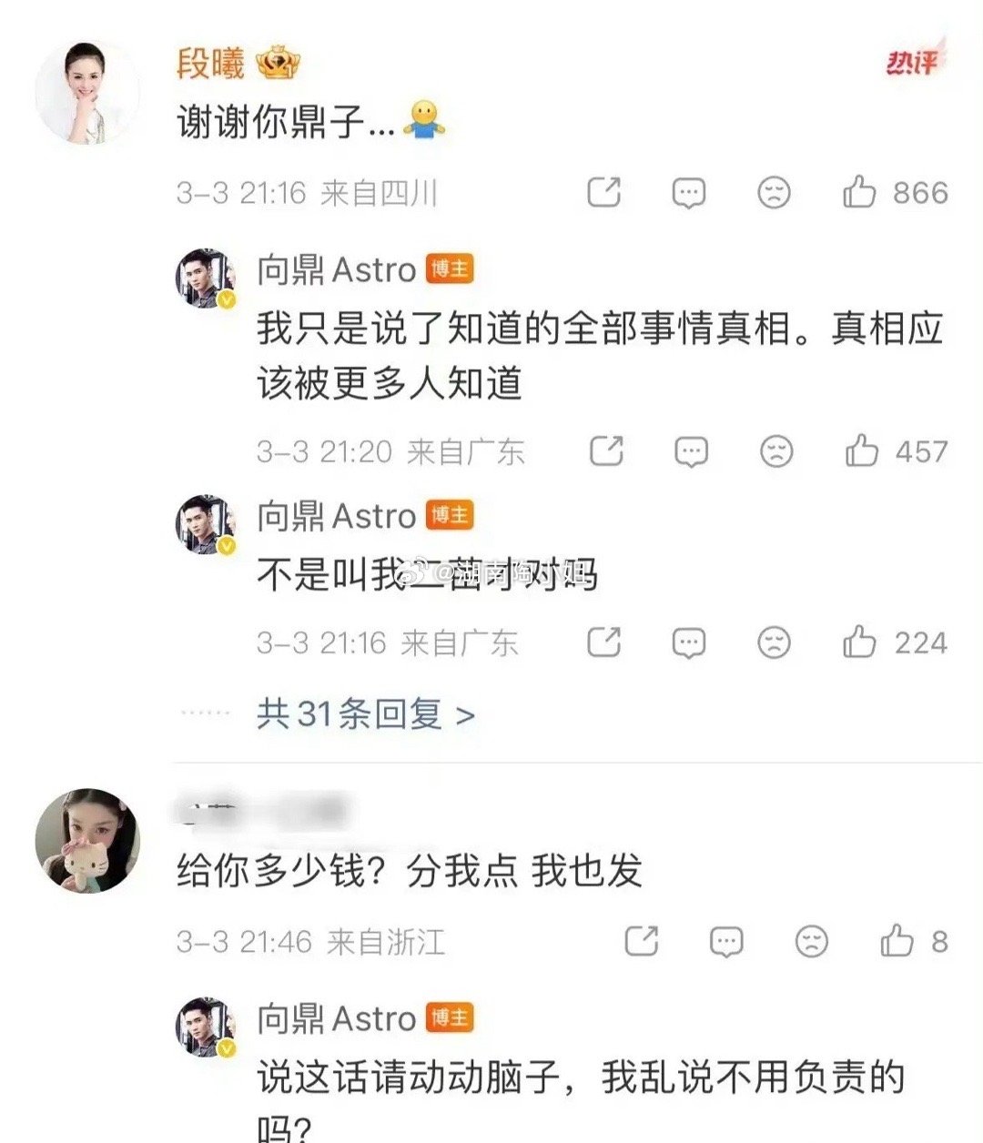 他很遗憾地对段曦说:“要是早2个多月认识你就好了,可以告诉你的男朋友在背着你认识新的女生。”段曦随后转发回应“谢谢你鼎子”,还发长文控诉自己被造谣“掌掴谢娜”“插足感情”,被网暴多年,却没人给她道歉。面对网友“给你多少钱”的质疑,向鼎回怼:“说这话请动脑子,我乱说不用负责的吗?”还有人质疑他“谁追谁”的说法,他也硬气回应:“我只是说了知道的全部事情真相,真相应该被更多人知道。”这场风波的导火索,是谢娜要求薛之谦为多年前《吐槽大会》的发言道歉,段曦顺势翻出旧账,而向鼎的“作证”,更是让这段尘封的感情纠葛,再次变得扑朔迷离