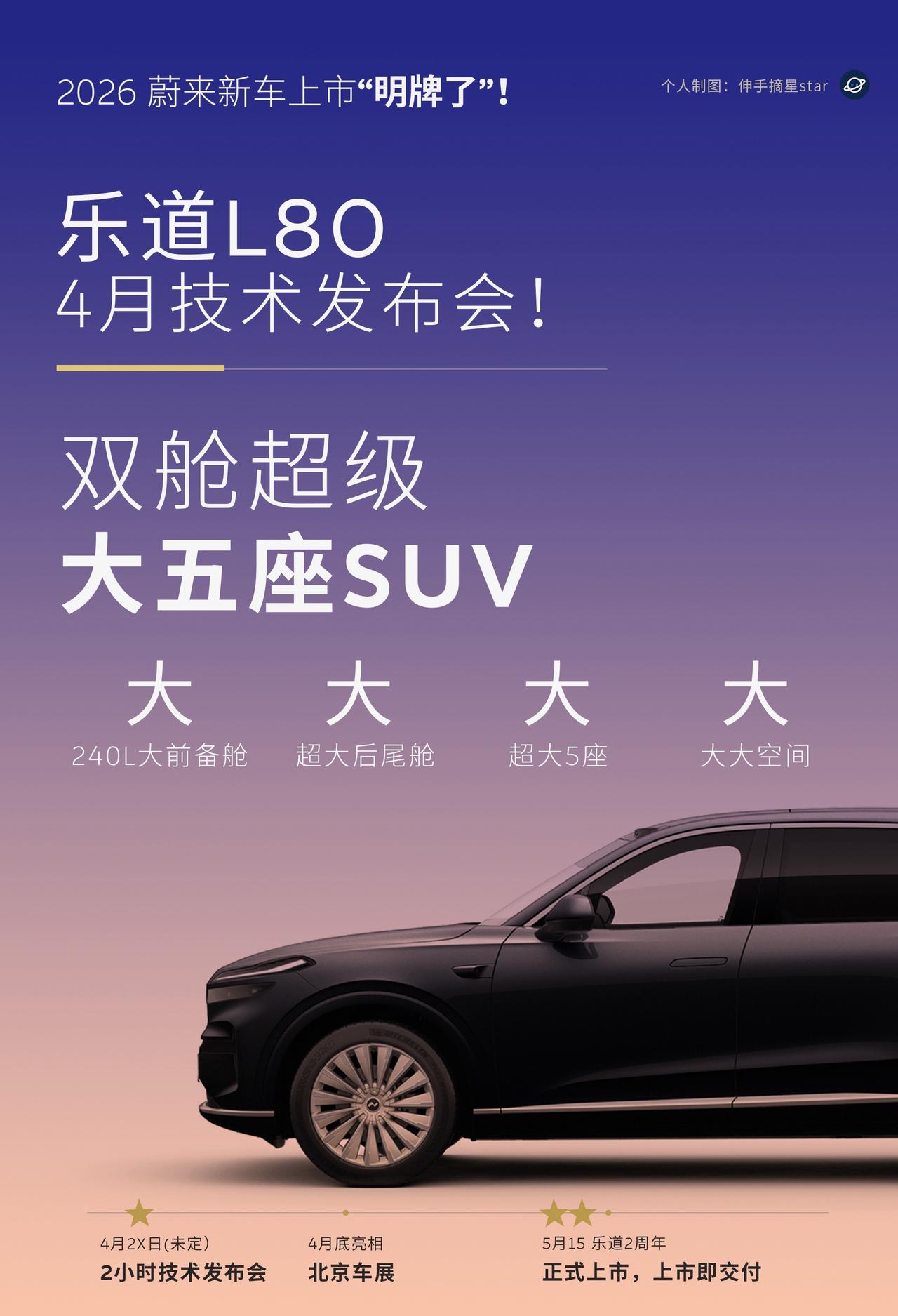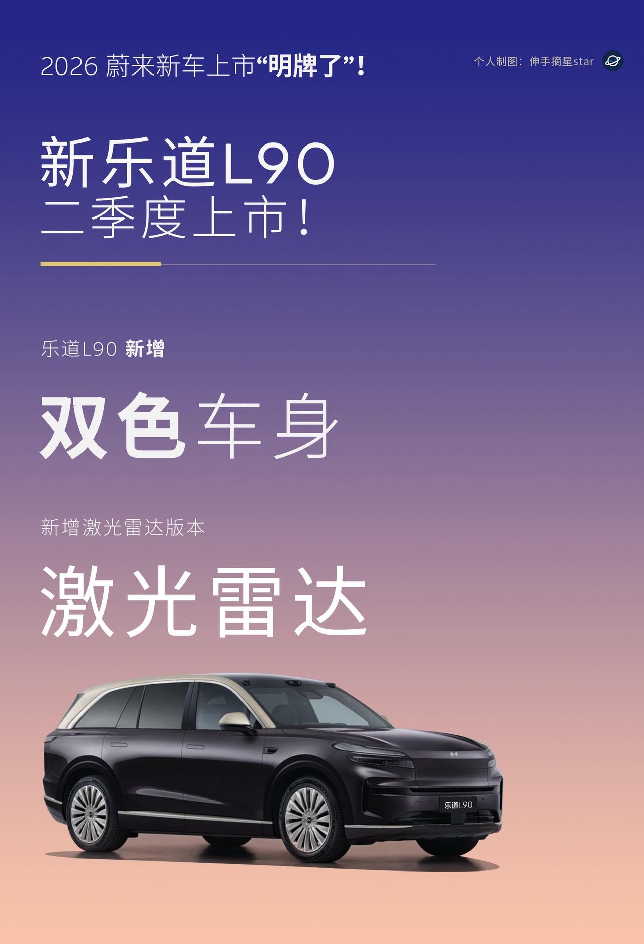 蔚来品牌: 26款5566即将上市, 新增智驾小蓝灯, 双6车型支持选副驾0重力座椅。 小蓝灯,2代车型支持后升级。 ES9 全球科技旗舰SUV 今年全球技术最先进的SUV,没有之一。 搭载蔚来所有的最尖端的技术。 全线控,全主动悬架,SKy OS、神玑… 乐道L90 二季度上新 新增双色车漆, 激光雷达车型,定价略贵一点。 乐道L80 双舱超级大5座SUV 有着“乐道L90的5座版”传说。 4月技术发布会, 5月上市交付。 定价略低于L90。 萤火虫Firefly, 继续全球发光, 3.5日亮相泰国。 今年不断上新限量版。 蔚来 李斌 蔚来ES9 新能源汽车