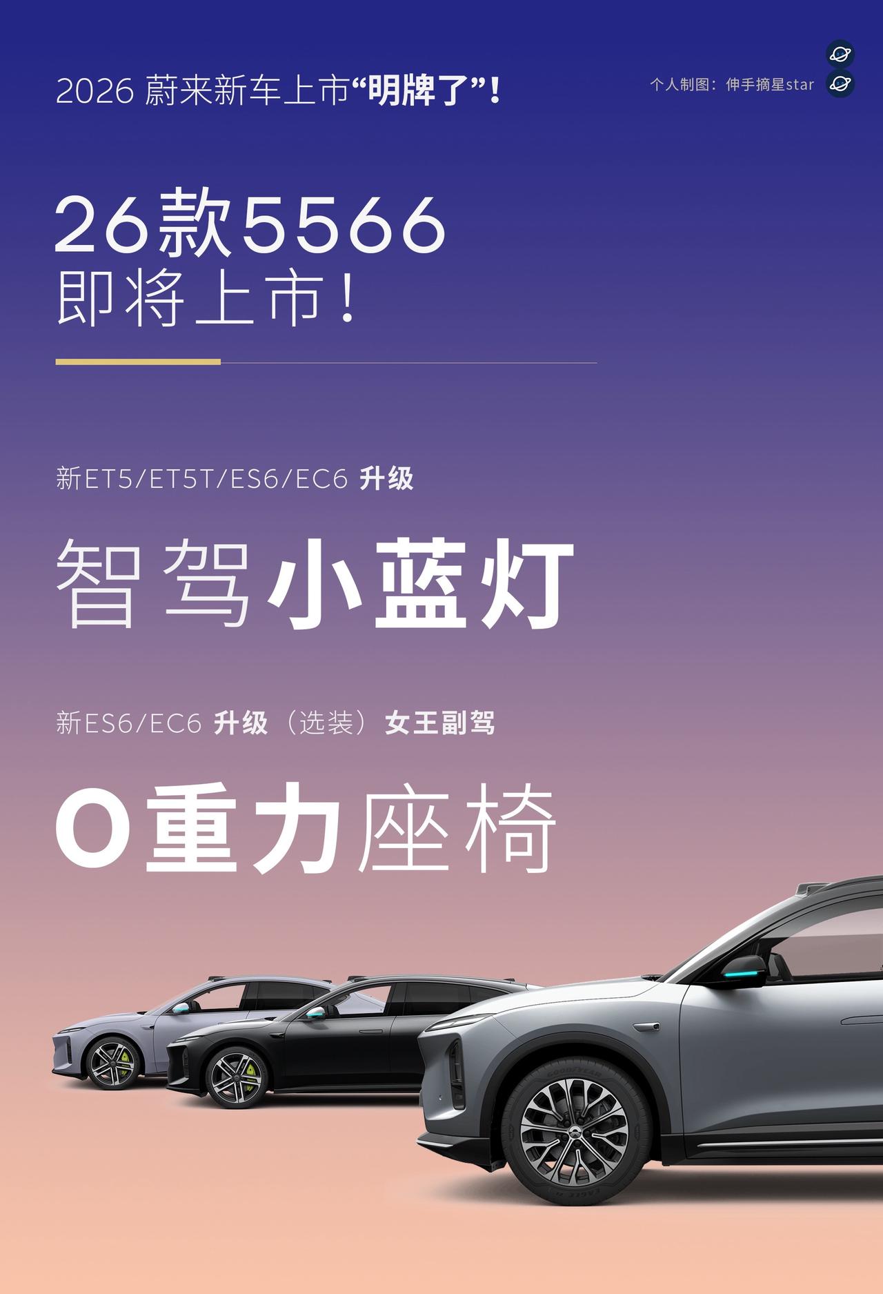 蔚来品牌: 26款5566即将上市, 新增智驾小蓝灯, 双6车型支持选副驾0重力