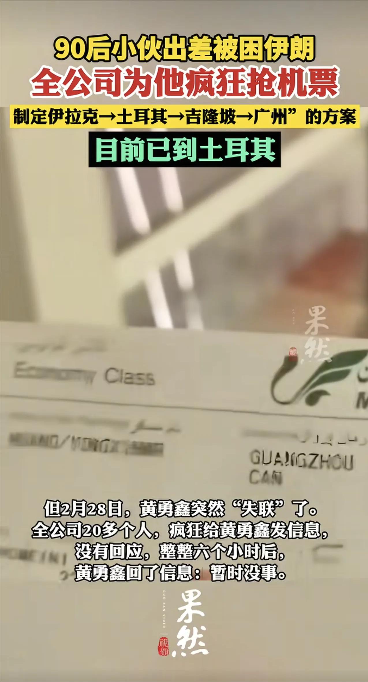“神仙同事”。伊朗,一28岁广西小伙黄勇鑫原本只是去伊朗出差,结果突然赶上爆发冲突,直接被困在伊朗,人还突然失联6小时,好不容易联系上他后,就在他孤立无援的时候,远在几千公里外的全公司同事开启了“跨国救援”,20多个人帮他抢机票、规划路线,硬是搞出了一条“伊拉克→土耳其→吉隆坡→广州”的绕地球半圈回国方案。网友:这班加得太值了,这同事关系比黄金还硬! 2026年3月初的广州,某小微公司的几块电脑屏幕依旧亮到凌晨。屏幕上没有任何销售报表,只挂着一张极度扭曲的跨国地图动线。 伊拉克埃尔比勒,飞往土耳其伊斯坦布尔,中转马来西亚吉隆坡,最后落地中国广州。 这是他们为28岁核心业务员黄勇鑫,硬生生从战火里拼凑出的逃生通道。几天前的2月28日,美以导弹袭击彻底切断了伊朗当地的通讯基站。 长达6个小时的物理“信号蒸发”,把这个原本只有22名员工的扁平化小团队,瞬间逼成了一个全天候运转的战时指挥部。 前线在坍塌,物理世界的距离和金钱被导弹无限拉长。黄勇鑫单点向伊朗北部边境大不里士进行物理移动,却一头扎进了该城的轰炸区。 战时资源瞬间遭遇地狱级挤兑。平日里15公里只需10块钱的车程,车费当场狂飙至260元。 更荒诞的是,路边甚至出现了张口索要15亿里亚尔的黑车,折算下来是整整7000元人民币的趁火打劫。 借着一名外国商人的顺风车,他在拥堵的车流里死死耗了一个小时,才勉强挪动了这15公里的逃命路,向边境线无限逼近。 而在几千公里外的广州后方,是一场没有硝烟的数字狙击战。同事曾传斌盯着新闻里滚动的战况,按下了全员跨国寻人的启动键。 这22个人没有大公司那种繁琐的安保审批和SOP模型,他们全靠群居本能进行切割分工。疯狂拨打死机号码、拉网式穷举中东人脉。 更多的人开始在各大航司的底层数据库里进行“外科手术”般的检索。算时区差、算过境签政策、算大巴路网的车程耗时。 这是一场信息流通两极反转的极端测试。外面找人找得震耳欲聋,黄勇鑫靠近边境连上网后传回的,却只有极其收敛的五个字:“暂时没事”。 向外,他承接着22个同事极致的救援声浪。向内,他对老家父母执行了最严苛的情报封锁。战区的血雨腥风,被他彻底消音。 为什么这么狠?翻开他的履历就懂了。早在2024年10月,他就在伊朗经历过局部军事基地冲突。真实的幸存经验让他比谁都清醒。 他深知战区经验绝对不能越洋传递给家人。与其制造无用的恐慌,不如强忍透支,亲手筑起一堵密不透风的“一切顺利”防火墙。 从2月28日到3月2日,极窄的跨国逃生窗口把他的睡眠总和无情压缩到了可怜的12小时。 掏出50美金买下跨境大巴票,在拥挤嘈杂的车厢里生熬30个小时。生理机能濒临极限,红血丝爬满双眼。 但当他在护照检查站枯站了整整5个小时后,手机里震出的,不再是毫无用处的口头安慰。 那是一串被后方硬生生从系统里抢出来的“机票确权码”。这是数字代码对前方物理暴乱实施的降维打击与精准救援。 随着行程单彻底闭环,今年3月初,踏上回国跳板的黄勇鑫引发了全网近乎狂热的舆论发酵。 网友们惊呼这是民间版的《万里归途》,把这群同事捧成“比黄金硬的神仙同事”。这难道仅仅是因为路线规划的物理难度有多高吗?显然不是。 在日益冷漠、动辄将身边人视为竞争对手的2026年职场语境下,这22个人的硬核越界,撕裂了冰冷的打工铁律。 一纸单薄的商业雇佣契约,在导弹掠过大不里士天空的那一晚,悄然质变成了一份无比厚重的生命托付。 真正的团队凝聚力,从来不在酒桌的推杯换盏里。而是在那个彻底失联的恐怖黑夜,你的身后,有22双熬红的眼睛替你死死盯着前路。 参考:90后小伙出差被困伊朗,全公司20多个同事为他疯狂抢机票,跨时差云救援,本人回应:未和家人吐露半个字,已到土耳其——大象新闻