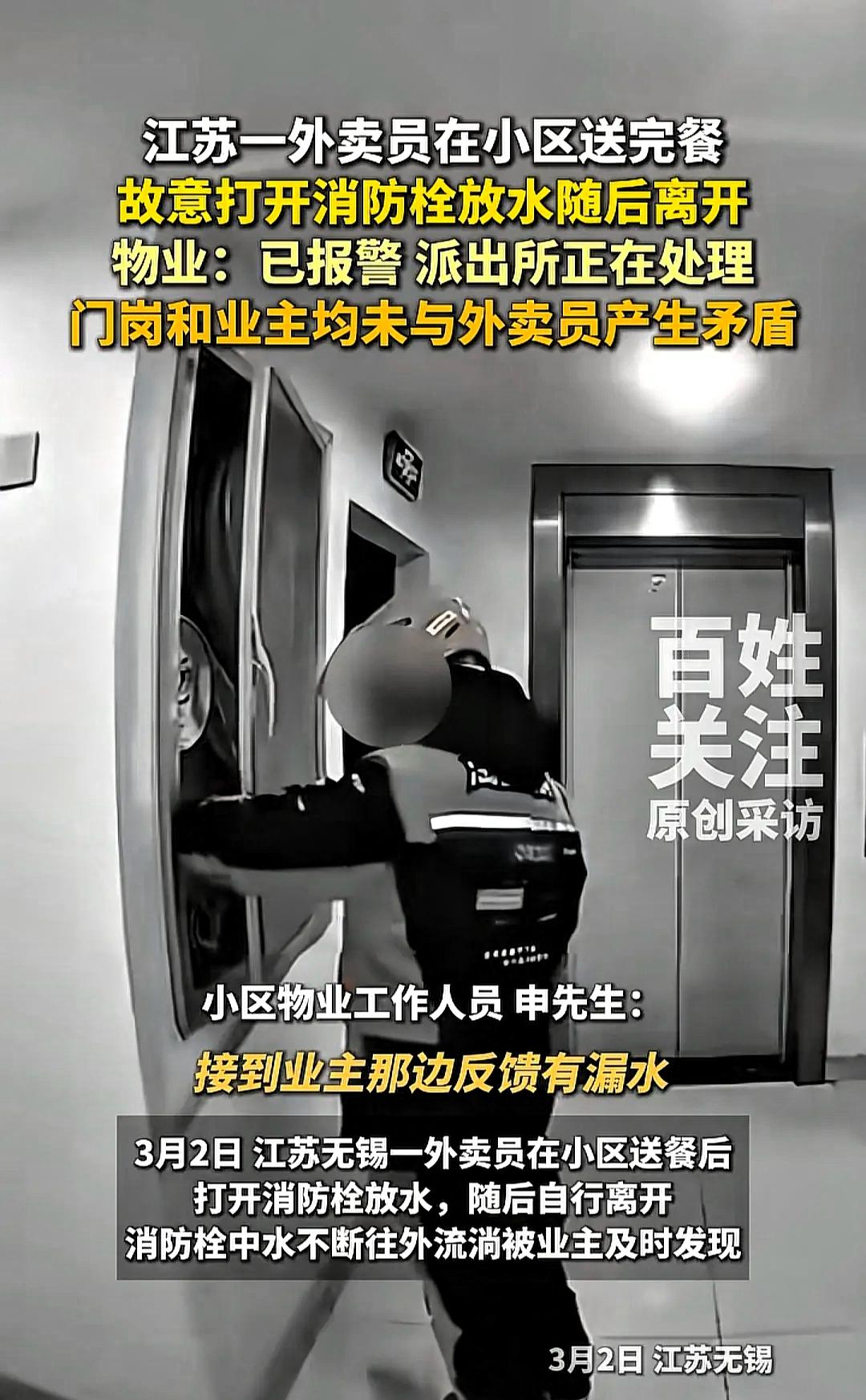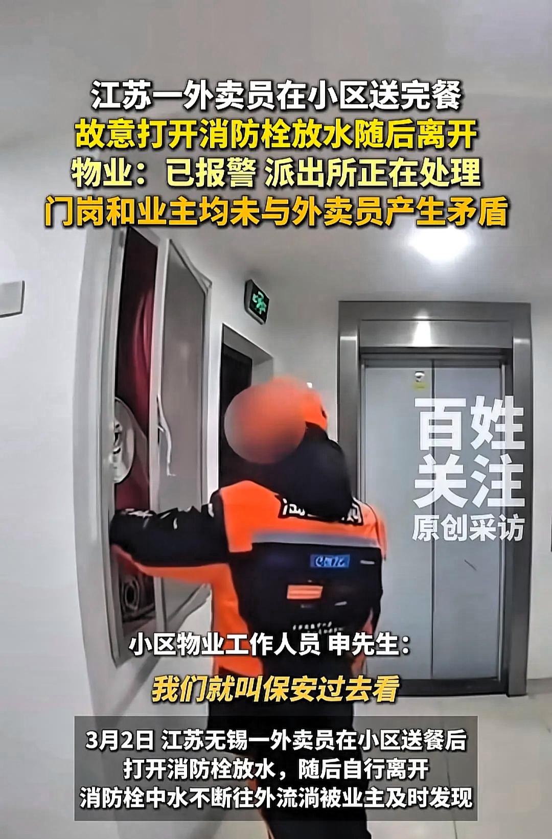 近日,江苏无锡一名外卖员在小区送完餐后,故意打开楼道的消防栓放水,然后就离开!