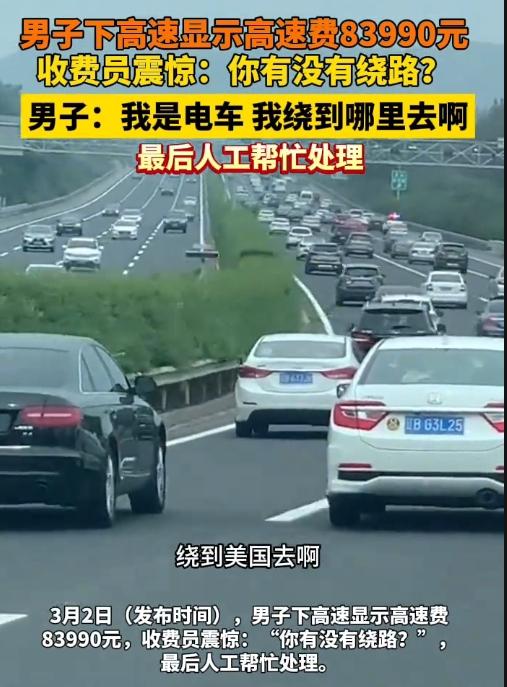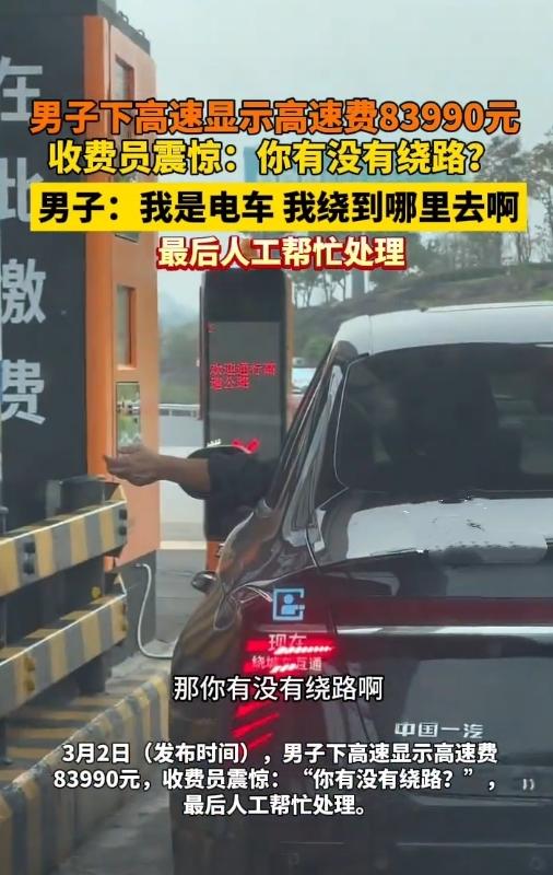 好家伙!下高速时收费站屏幕上的数字差点把人看傻——83990元! 收费员手都抖了,盯着司机问:“你这是绕了多少路啊?” 司机是个开电车的大哥,一听这话直摆手:“我开的是电车!满打满算续航就那么点,我能绕到哪儿去?难不成绕出省界绕出国了?” 周围排队的车主都凑过来看热闹,有人掏出手机拍照,有人帮着算:这钱够买小半辆电车了,跑一趟高速比买车还贵? 后来还是人工重新核对,才发现是系统出了岔子。可这事想想真让人后怕:要是当时司机没较真,或者没人工复核,这近八万四的“天价过路费”难道就得自己扛? 高速收费系统偶尔出问题能理解,但差这么多也太离谱了。咱开电车跑高速本来就得多操心续航,这下还得提心吊胆被系统“坑”,换谁不窝火? 你们遇到过类似的收费乌龙吗?要是自己碰上这种事,会咋处理?赶紧来评论区聊聊,别忘了点赞转发,让更多人看看这离谱事儿!车主下高速遇天价通行费 来源:浪涨新闻