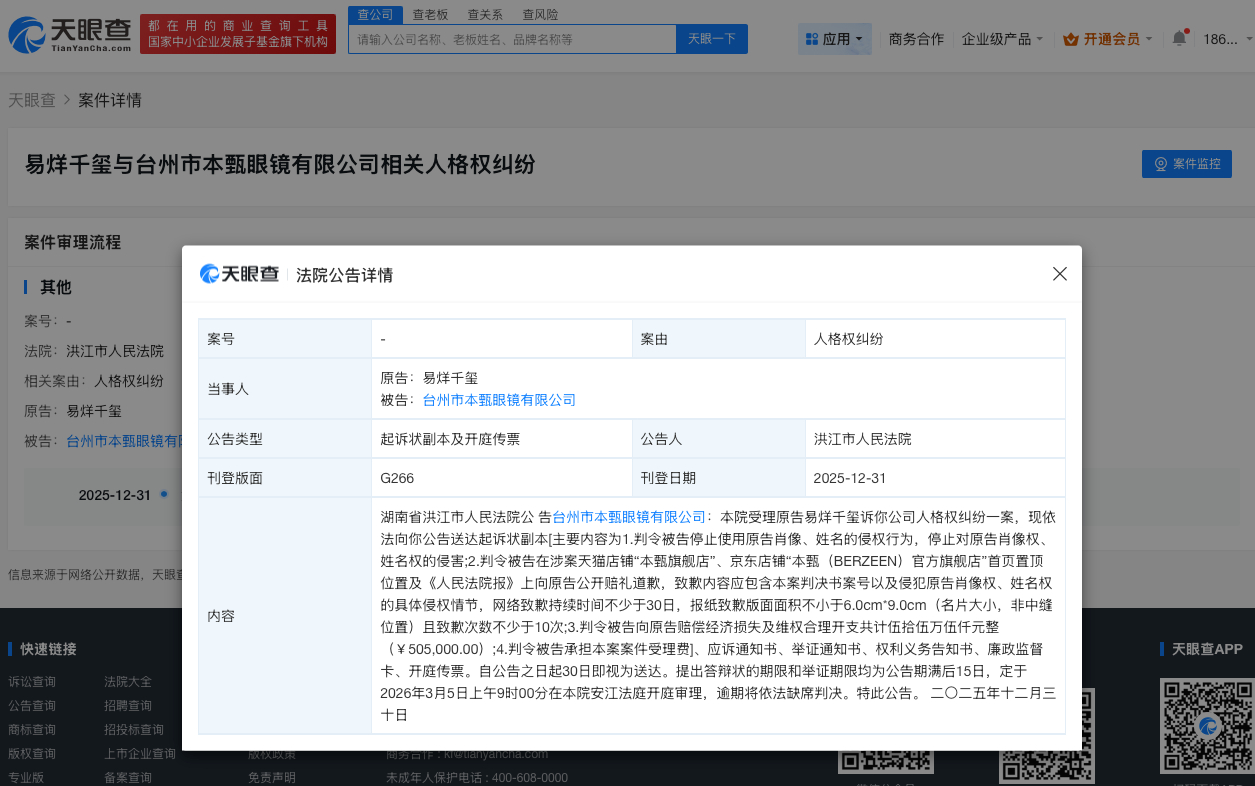 易烊千玺维权索赔50余万易烊千玺维权案件即将开庭天眼查法律诉讼信息显示,近日,洪江市人民法院向台州市本甄眼镜有限公司公告送达起诉状副本、应诉通知书、开庭传票等诉讼文书,涉及原告易烊千玺与被告台州市本甄眼镜有限公司相关人格权纠纷案件。原告请求法院判令被告向原告公开赔礼道歉,并赔偿经济损失及维权合理开支共计50.5万。该案将于3月5日开庭审理。
