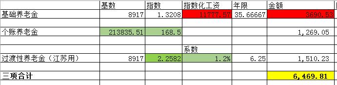 江苏苏州退休,35年8个月工龄退休拿到6500元。 一位苏州退休大哥的养老金,他是特殊工种,可以55岁退休,根据延迟退休政策,顺延3个月后,于2026年2月正式退休,累计缴费35年5个月,没有断缴过,个人账户本息共攒下21.38万元,基础养老金指数1.3208,过渡性养老金指数2.2582。 计算过程见图二。 他的养老金组成,基础养老金3690.53元,个人账户养老金1269.05元,过渡性养老金1510.23元。 三项合计6469.90元,平均工龄单价6469.9/35.67=181.38元。 这个单价是不是比常见的高出太多啦! 平时见到最多的,是一年100元单价,35年工龄,很多人认为应该4000元左右才对,为啥这么高? 1、过渡性养老金指数高,说明92-95年时收入高,退休时带来的回报高。 2、特殊工种折算了9个月,使得过渡性养老金年限又增加了9个月,增加181元左右。