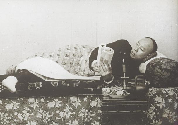 晚清,一位年轻读书人在卧榻上秉烛读书,是那个时代“万般皆下品,惟有读书高”的生动写照。 照片中的男子约二十出头,身着长衫,斜倚在铺有华丽锦缎的床榻上,神情专注地阅读手中的书卷。他的姿态放松,仿佛沉浸在书的世界里,与我们今天躺着刷手机的场景有几分相似。 他身旁的小几上,摆放着一盏油灯、茶壶和茶碗,油灯的微光,不仅照亮了书卷,也象征着他在科举之路上的“十年寒窗”。