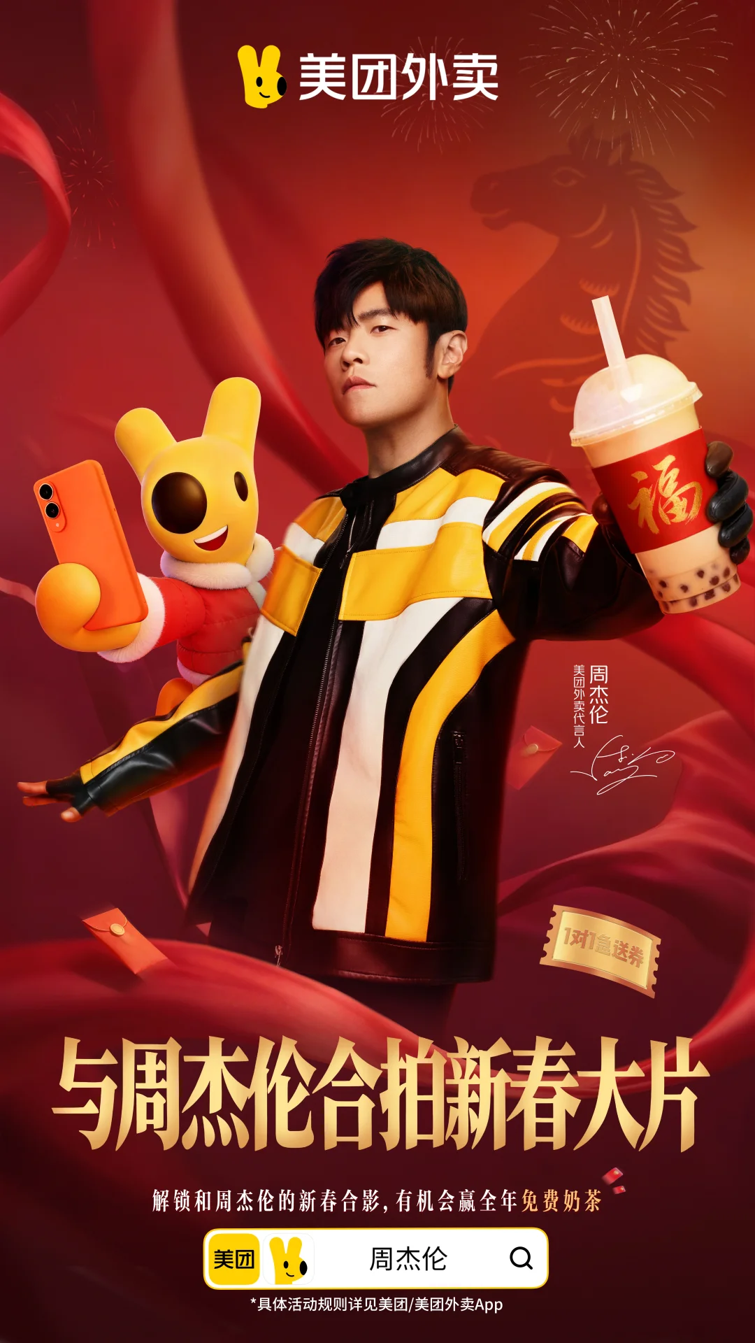想自己试试的话,方法很简单:上美团/美团外卖App,搜索「周杰伦」,就能一键生成你的专属合照。分享后还能抽奖,有全年免费奶茶、1对1急送券这些福利。今年过年,不如也来张不一样的“全家福”吧。