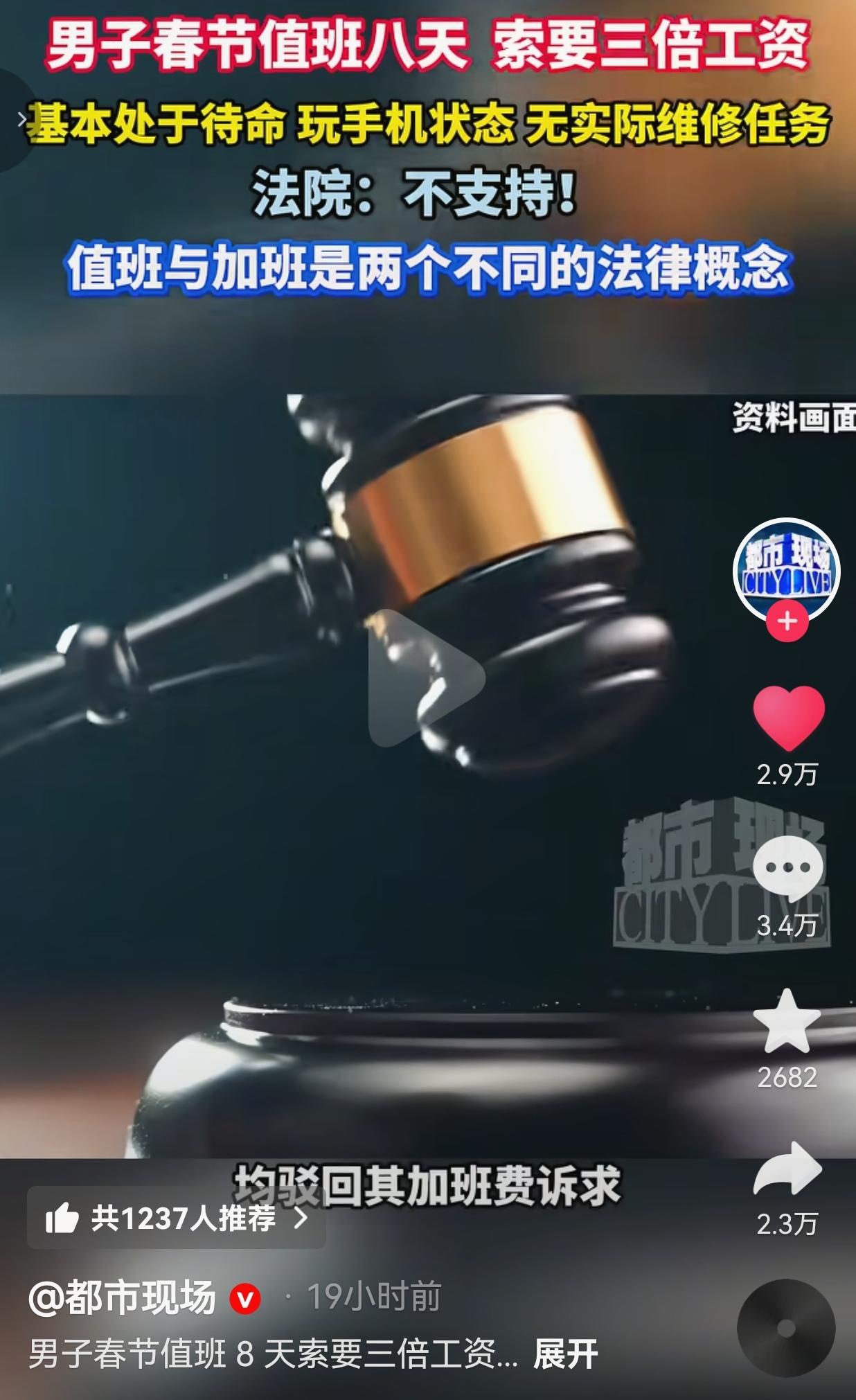 值班与加班真的不太相同,下面就是一个典型的案例!江苏无锡的须师傅,为了响应公司号召,主动申请春节留守值班,从正月初一到初八,整整8天都待在单位。 他本想着,法定节假日上班,三倍工资肯定跑不了,这8天下来,怎么也能多赚一笔。 万万没想到的是,事后他向公司索要6240元的三倍工资差额时,却被公司一口拒绝。 更让他没想到的是,闹上法庭后,一审、二审法院均驳回了他的加班费诉求。 法院给出的理由也很直接:你这是“值班”,不是“加班”! 庭审时,师傅自己也承认,这8天里,他每天就是到单位打个卡,然后就待在值班室里玩手机、待命。 整个春节假期,别说维修任务了,连个报修电话都没接到,完全是“人到岗,活没干”的状态。 看到这儿,很多打工人可能都懵了:“我人都在单位待着了,凭啥不算加班?” 这事得掰扯清楚,“值班”和“加班”,虽然只差一个字,但在法律上,那可是天差地别。 加班,是你在法定工作时间之外,继续干着本职工作,强度和平时上班一样,甚至更累。比如工厂赶订单、客服接热线、医生做手术,这种实打实创造价值的,法律才规定必须给三倍工资,而且不能用补休来代替。 值班呢?更多是单位为了安全、消防、应急等需要,安排你在那儿“看场子”。工作内容跟本职工作关系不大,强度也低得多,期间你可以休息、打盹,甚至像须师傅一样玩手机。这种情况,法律上不认定为加班,单位一般只需要按规定给点值班补贴就行。 法院的判决,看似不近人情,其实是在划清法律的边界。它在提醒我们:法定节假日的三倍工资,买的是你的劳动,而不是你的“在场”,前提是实际提供正常劳动。 同时,这事也给我们所有人提了个醒:第一、以后公司再让你节假日“值班”,先问清楚是“加班”还是“值班”,有没有书面通知,待遇怎么算,别等事后再扯皮。用人单位也应明确区分值班与加班,避免纠纷。 第二、如果真的是加班,一定要保留好工作记录、聊天记录、考勤记录等证据,不然真到了法庭上,空口无凭是站不住脚的。 第三、我们理解企业的难处,也愿意在特殊时期挺身而出,但这份奉献,也应该得到对等的尊重和明确的回报。 针对此事,你有什么看法呢?