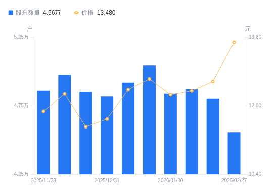 日期A股户数(户)流通A股户均持股数(股)户均持股市值(万元)2026-02-274558018490.0824.922026-02-134802617297.3121.742026-02-104872517028.2421.032026-01-304838817146.8321.022026-01-205047316438.5120.762026-01-094920116863.5020.882025-12-314818817218.0020.132025-12-194853317095.6019.682025-12-104975816674.7320.482025-11-284861117068.1720.26