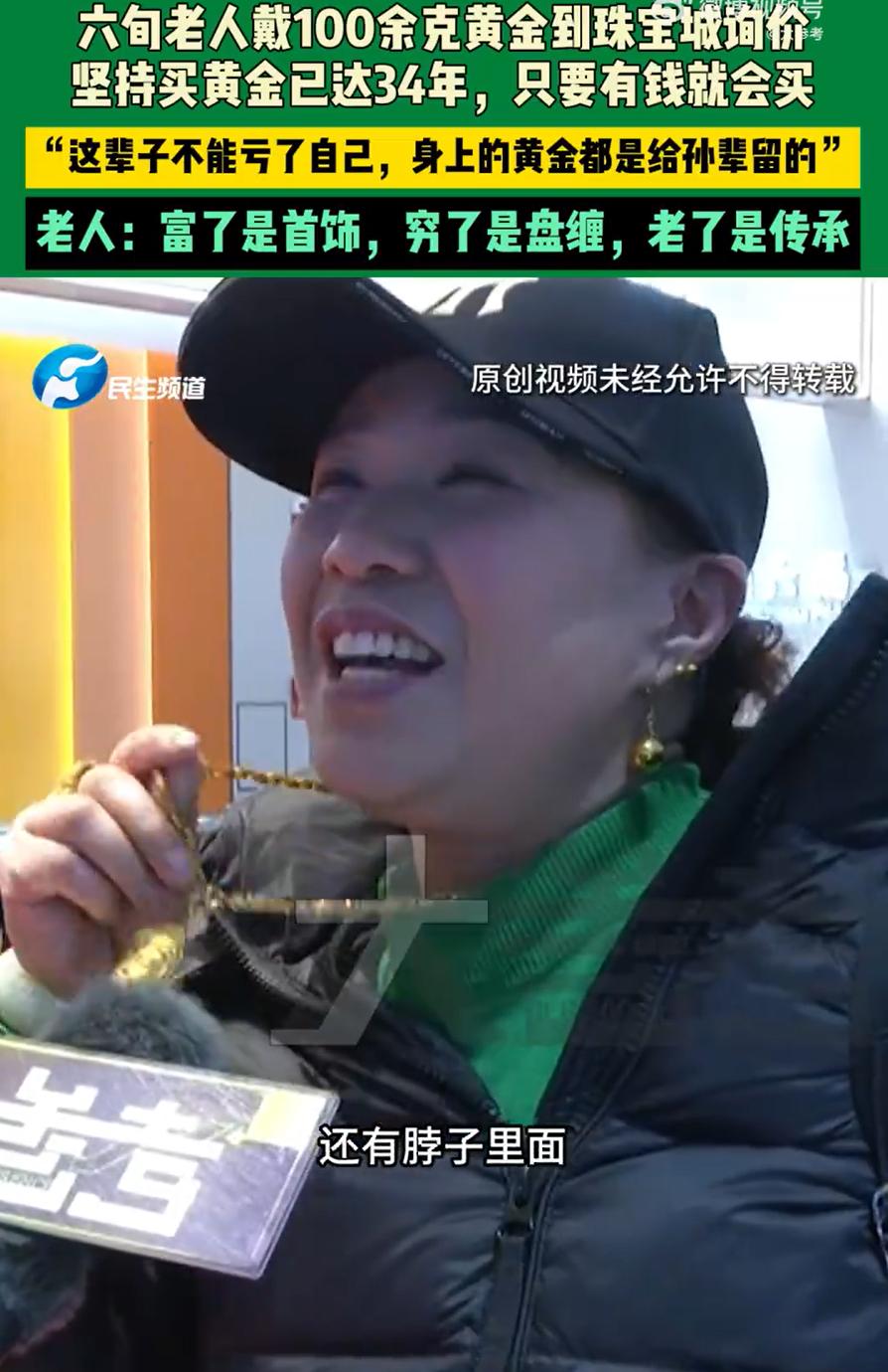 这心态就对了!河南郑州,一位六旬老人全身佩戴着超100克黄金到珠宝城准备买买买,当记者问到她都有这么多黄金了,还买它干嘛时,女子表示:富了是首饰,穷了是盘缠,老了是传承。网友调侃:这确实不止是装饰,这是明目张胆的炫耀来了 阿姨说自己买黄金的历史有34年了。第一次买是24岁刚上班,发了工资奖励自己一条金项链,那时候金价才80块钱一克。这一买就停不下来了,手里但凡有点闲钱,就换成黄金 她说得很实在:这辈子不能亏了自己,这些金饰最后都是给孙辈的 网上有人说,这哪是装饰,这不明摆着炫富嘛 但其实换个角度想,一个普通工薪阶层,用三十多年的时间,一点一点攒出这么多黄金,这哪是炫富,这分明是过日子的一种智慧 黄金不是股票,不会一夜翻倍;也不是理财,没有利息。但它有个好处——踏实。不管外面经济咋样,纸币咋印,它就在那儿,拿在手里沉甸甸的 现在的年轻人可能不太理解这种习惯。大家更喜欢把钱放在手机里,买个基金,投个理财,讲究的是钱生钱。但老一辈经历过苦日子的人,他们对安全感的理解不一样。黄金对他们来说,不只是首饰,更像是一个看不见的底气 阿姨那句富了是首饰,穷了是盘缠,其实把黄金的两面性说透了。日子顺风顺水的时候,它是你脖子上的项链、手腕上的镯子,是体面也是爱好。万一真遇上个什么坎儿,它也能帮你度过难关 说到底,每个人有每个人的活法。有人喜欢把钱花在吃喝玩乐上,有人愿意存银行,有人像这位阿姨一样,把钱换成黄金戴在身上。没有对错,只是选择不同