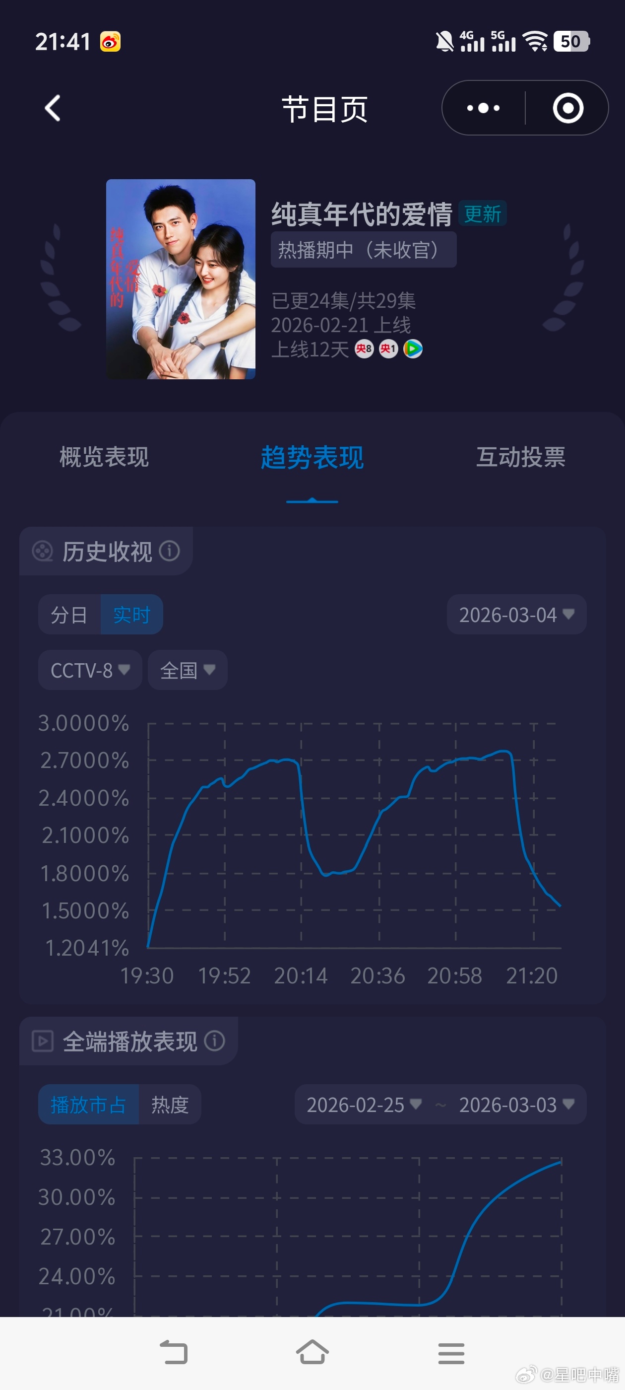 纯真年代的爱情大结局央视版还没大结局!今晚收视率走势很不错!双集平均2.2997,cvb估值2.2997×0.915=2.104