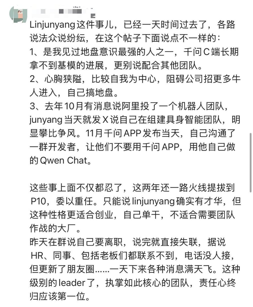 林俊旸离职有反转 这种情景小说看得多了。没想到还真刷到了个现实职场。阿里好像把核心团队交给他了吧?离职就失联,同事圈爆打造人设?没责任心?咱也不敢过度解读。