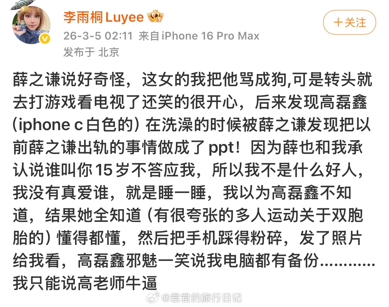李雨桐深夜讲故事,大意就是:高磊鑫撒谎说怀孕了,薛之谦才跟他结婚薛的朋友们都觉得