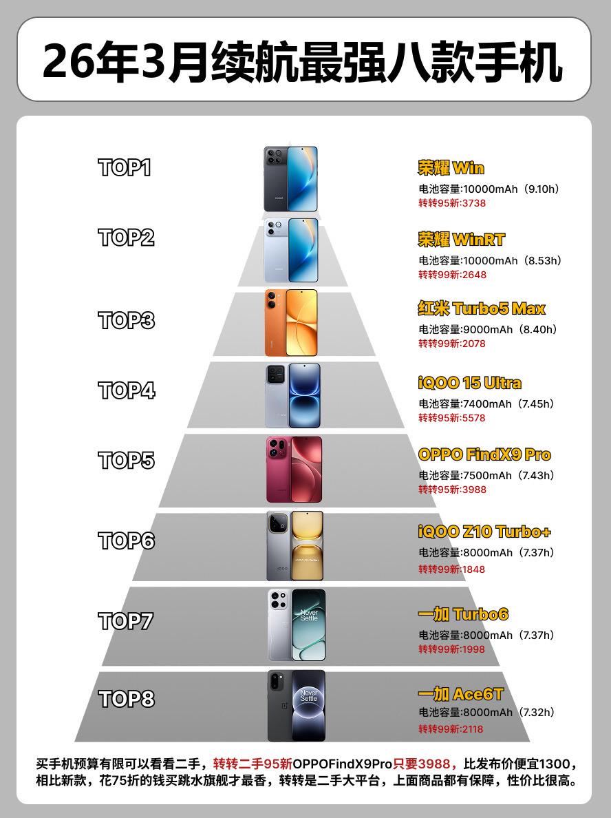 26年3月份续航最强的8款手机。荣耀win荣耀winrt红米turbo5max iqoo15ultra数码科技 手机手机推荐oppofindx9pro iqooz10turbo+