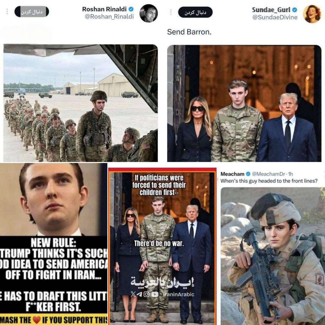 “请特朗普派19岁的儿子巴伦与美军一起对抗伊朗吧”!这两天,美国社交媒体发起“派巴伦参战”的话题标签,并登上热搜。 可能有人刷到这个热搜会懵,好好的怎么突然喊一个19岁的年轻人上战场?而且还是美国前总统、现任总统特朗普的小儿子巴伦。 先把背景说清楚,这不是网友随便瞎起哄,背后是2026年以来美伊关系的持续紧张。2月底的时候,美国和以色列没等谈判结束,就对伊朗发动了联合军事打击,一下子把中东局势搅得鸡犬不宁。 巴伦是2006年3月出生的,到现在还差半个多月满20岁,算下来正好19岁,完全符合美国美军17到35岁的入伍年龄要求。 这个年龄,放在普通美国家庭,说不定就会被征召入伍,派到中东前线。网友之所以盯着巴伦,核心就是不服气。 大家都知道,美国的精英阶层早就有“好男不当兵”的风气,尤其是政客和富豪家的孩子,总能找到办法逃避战争。 最典型的就是小布什,当年越南战争的时候,他从耶鲁毕业,本该被征召入伍,却轻松进入得克萨斯州国民警卫队,成功避开了前线作战。 还有前副总统切尼,越战时期正值青壮年,却先后4次申请缓期服役,事后还直言自己当时有“其他优先次序”。 现在特朗普一边对伊朗强硬施压,甚至放话如果谈判不成,就准备采取军事行动,让美军直面伊朗的威胁。 另一边,他的小儿子巴伦却过着养尊处优的生活,被媒体称为“亿万美元宝贝”,从小就很少接触这些风雨。 2024年的时候,巴伦曾被选为共和党全国代表大会的佛州代表,却因为“日程安排”拒绝了,之后也一直和政治保持着距离,没怎么参与父亲的竞选活动。 特朗普虽然总夸巴伦聪明,说他对政治感兴趣,还会给自己提建议,却又反复强调巴伦“非常年轻”。网友发起这个话题,说白了不是真的想让巴伦去送死,而是一种讽刺。 他们想问问特朗普,你天天喊着对伊朗强硬,让普通美国家庭的孩子去前线冒险,你自己的儿子正好到了入伍年龄,怎么不派他去体验一下? 要知道,这次美伊冲突升级后,美国油价已经大幅上涨,普通民众的生活成本越来越高,而战争的风险却要普通士兵去承担。那些权贵子弟,却能安安稳稳地待在后方,享受特权。 这个话题能冲上热搜,也说明美国民众对这种“双重标准”的不满已经积累到了一定程度。不是巴伦做错了什么,而是大家看不惯政客们“说一套做一套”,自己鼓吹战争,却让别人的孩子去牺牲。 截至目前,特朗普和巴伦本人都没对这个热搜作出回应。但不管怎么说,这个话题已经戳中了美国社会的痛点——精英特权和普通民众的利益失衡。 毕竟,战争从来都不是某一群人的事,可在美国,特权阶层总能轻易躲开战火,吃苦的永远是普通人。这大概就是这个热搜最让人扎心的地方,也是它能快速爆火的核心原因。