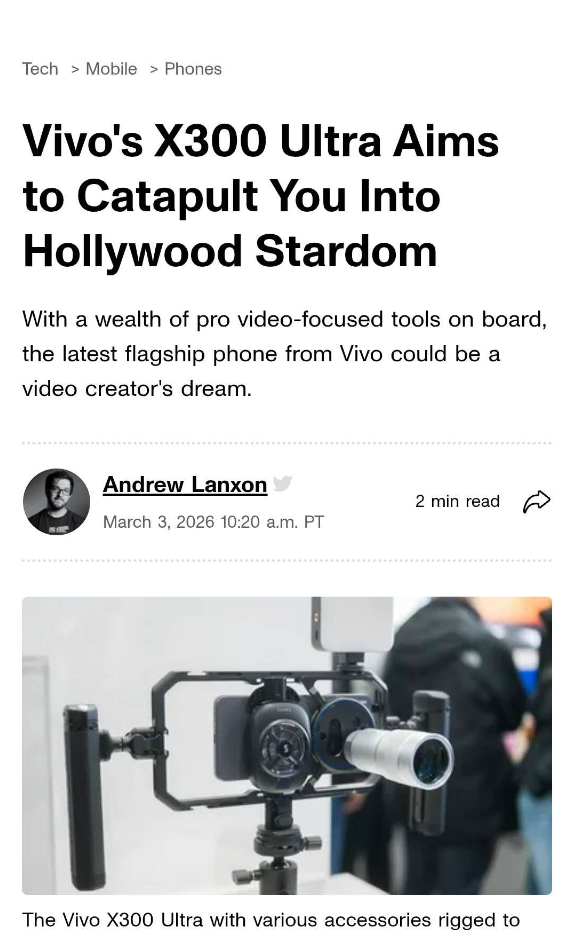 【解码时刻】CNET这波是真不藏着了,在MWC上手完 vivo X300 Ultra,直接一句:用它拍,你就是好莱坞明星。