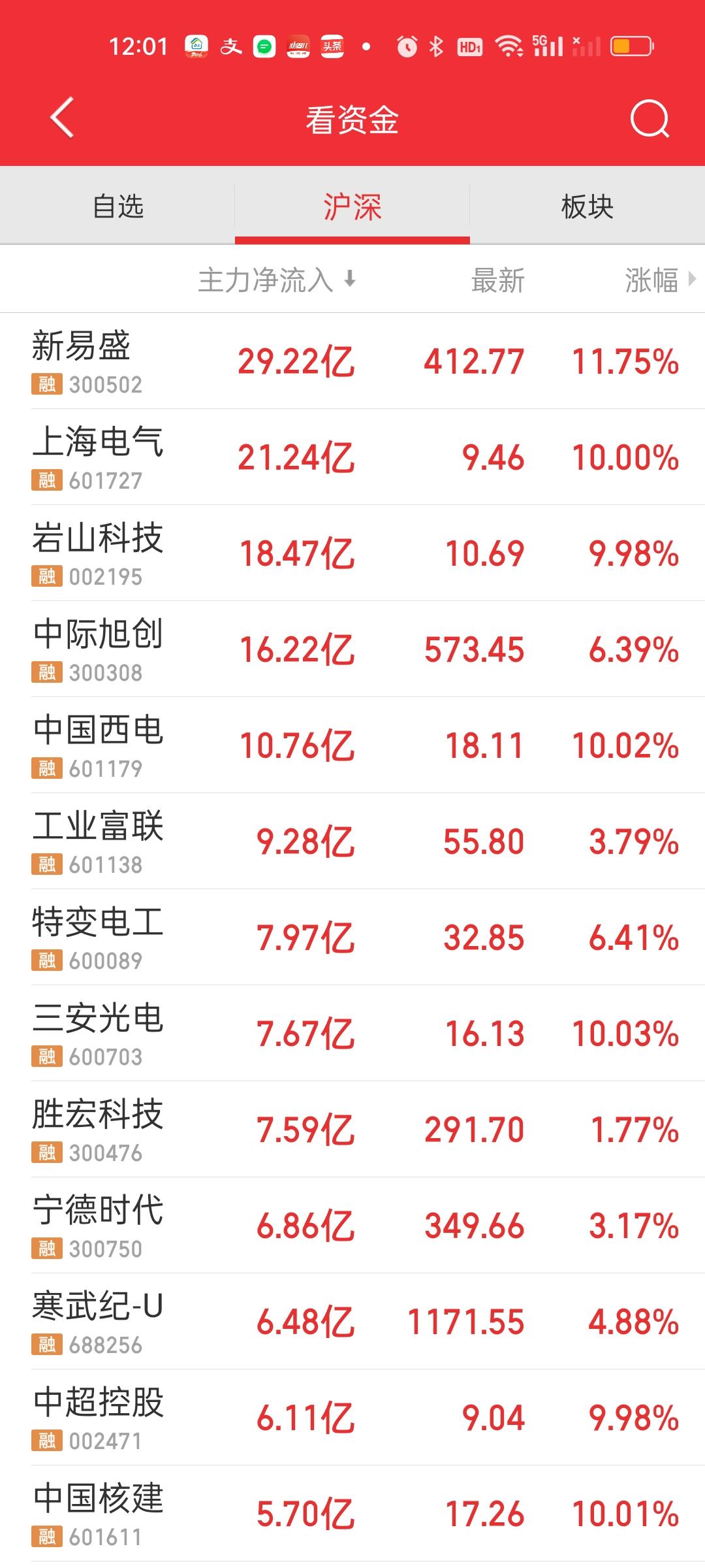 中午收盘了,大盘资金净流入267.89亿,成交量缩了931亿,超过4500家个股上涨,只有800多家个股下跌,有72只个股涨停。今天赚钱效应还是相当不错的。尽管如此,外围情况依旧没有根本性好转,今天上涨只能定义为反弹,还是需要提防随时可能到来的暴力下杀。 主力资金净流入方面,新易盛,上海电气,岩山科技,中际旭创,中国西电主力资金净流入资金在10亿以上,没有资金净流出超过10亿。