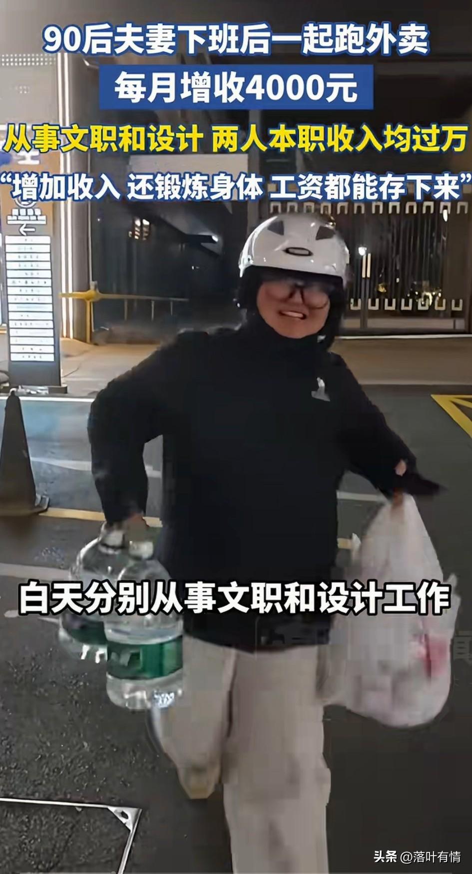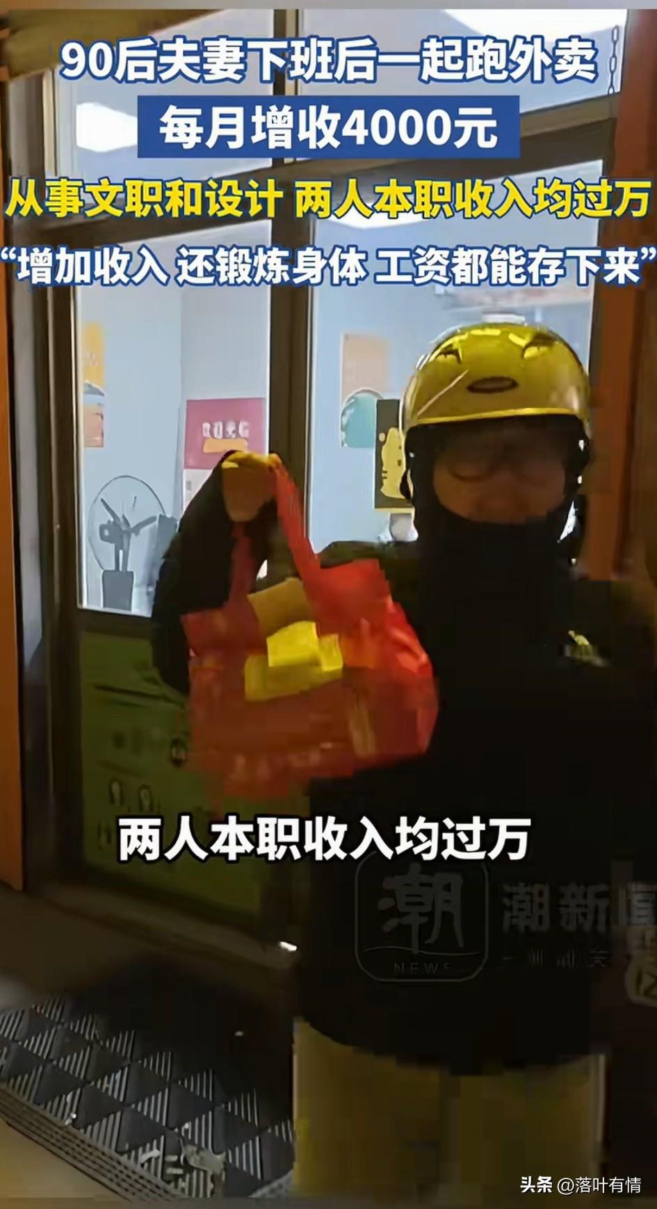 山东青岛两夫妻下班坚持送外卖, 一个月增收了4000块钱, 直接将生活成本全部负担掉, 现在两个人月收入都突破万元, 每个月工资就都能存下来, 他们两个从事文职和设计, 两个人干了三个月, 最大的感受就是能锻炼身体, 之所以能坚持干这么, 就是因为两个人相互鼓励。 平时坐办公室没有锻炼的时间, 下班了,刚好送外卖,锻炼身体, 不仅身体越来越好, 而且钱也挣到了, 表示这样的生活很满足, 不知道他们火了之后。 老板会不会坐不住了? 直接让两个人加班锻炼身体, 毕竟不能让他们太闲了, 大家觉得会不会发生这样的事? 青岛 夫妻跑外卖