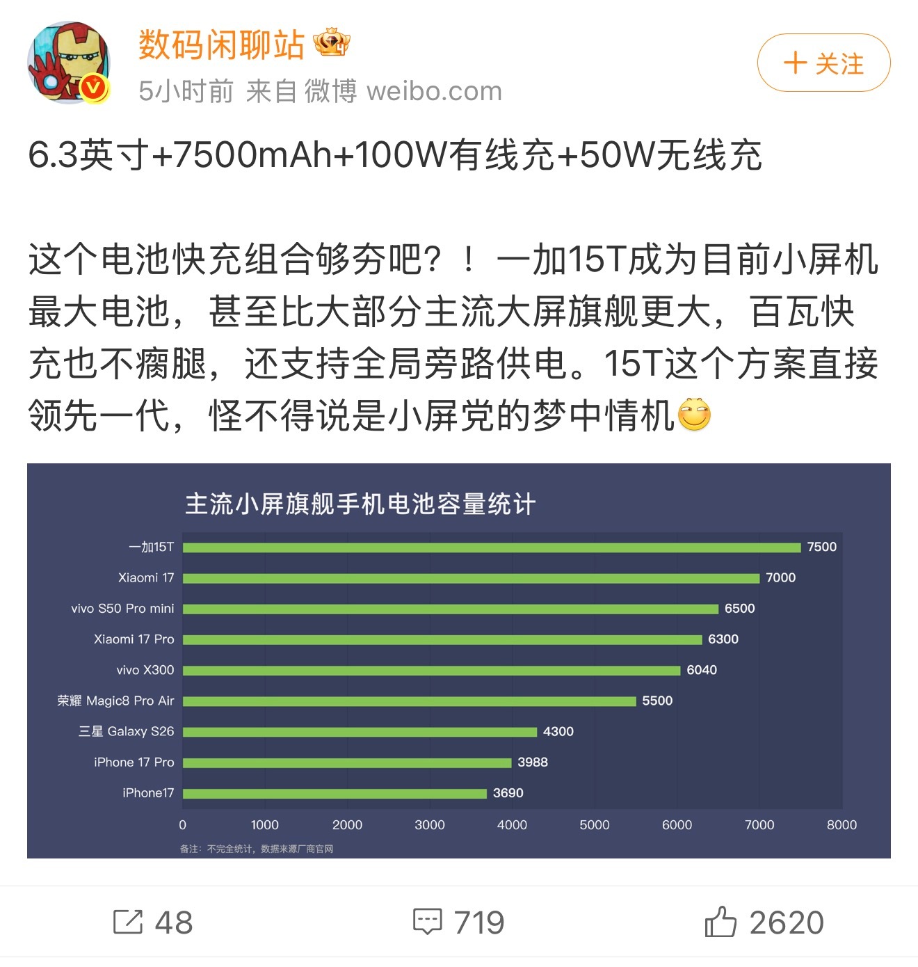 小屏党Dream Phone来了!一加15T在6.32英寸小机身塞进了7500mAh大电池,还有100W有线+50W无线充,续航能力和充电配置不仅在小屏赛道断层领先,还领先一众大屏旗舰。根据爆料,一加 15T还兼容苹果磁吸生态,这算不算补齐小了屏机最后短板?不仅续航顶,性能也很顶,安兔兔跑分超445万,这配置,全部拉满了。怪不得李杰直言,这就是小屏用户苦等已久的Dream Phone,看来是当之无愧的“小夯机”天花板啊!一加15T